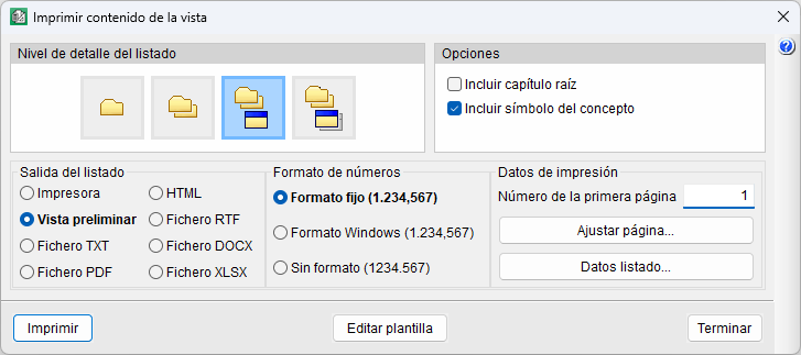 Permite definir el nivel de detalle a imprimir: solo los capítulos del primer nivel, todos los capítulos, todos los capítulos con sus unidades de obra o todos los capítulos con sus unidades de obra y los conceptos unitarios. También puede incluir el contenido del capítulo raíz y el símbolo del tipo de concepto.