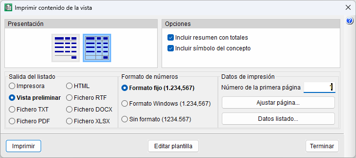 Permite imprimir con o sin líneas divisorias de columnas, incluir un resumen con la línea de totales y mostrar el símbolo del tipo de concepto.