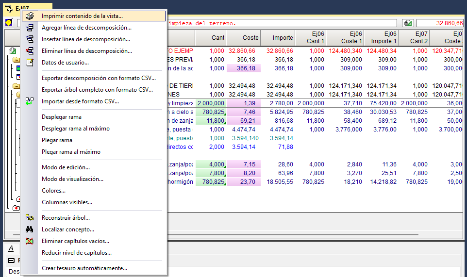 Es posible imprimir fácilmente la información mostrada en el área de trabajo de las ventanas "Árbol de descomposición" o "Lista de conceptos", utilizando la composición de columnas visible en pantalla, sin necesidad de crear o modificar una plantilla de listado existente.