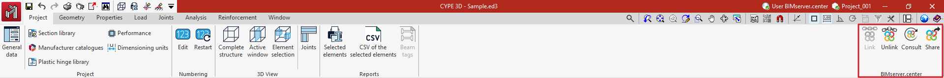 Las opciones del bloque "BIMserver.center", dentro de la barra de herramientas superior de la pestaña "Obra", permiten vincular la obra y exportar la información a un proyecto de BIMserver.center.
