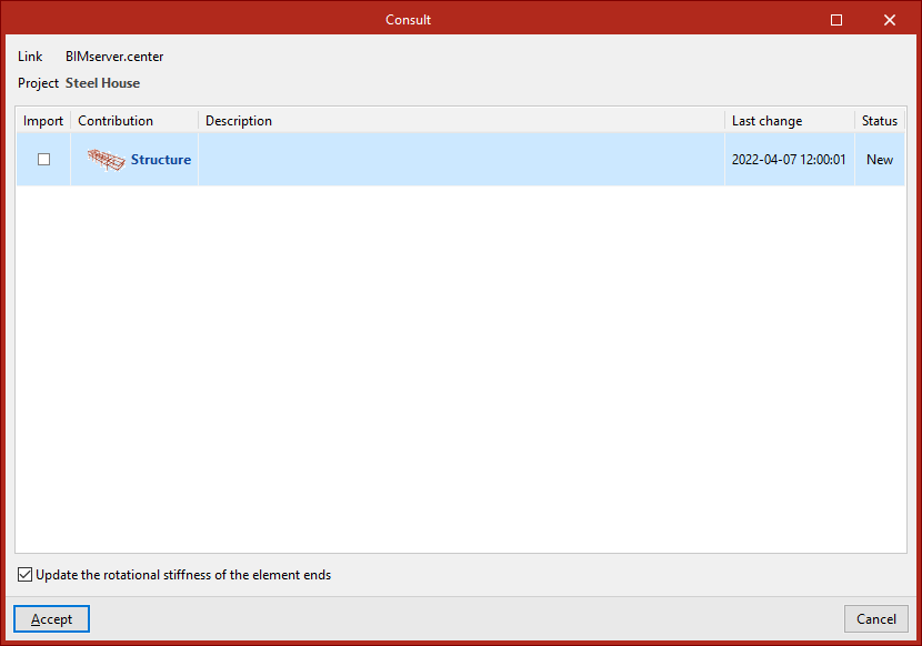 La casilla inferior permite "Actualizar las rigideces rotacionales de los extremos de las piezas". Esta opción permite importar la rigidez rotacional de las uniones calculadas en CYPE Connect o StruBIM Steel (y exportadas a BIMserver.center) en la estructura original de CYPE 3D.