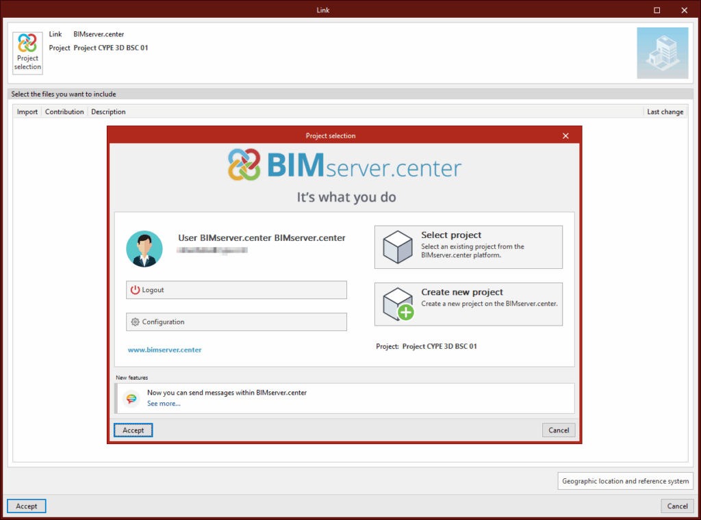 La primera opción permite "Vincular" la obra a un proyecto de BIMserver.center.