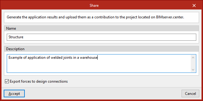 La última opción del bloque permite "Compartir" la información del modelo al proyecto de BIMserver.center.