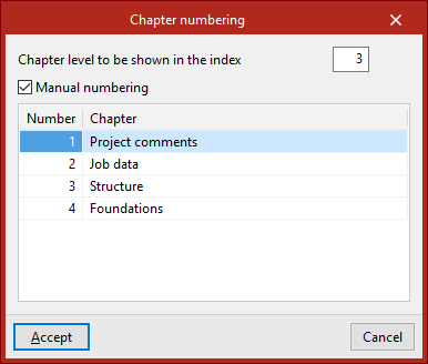 El botón "Numeración de capítulos" de la parte superior permite modificar el "Nivel de capítulos a mostrar en el índice" y realizar una "Numeración manual", si es de interés, escribiendo el "Número" para cada "Capítulo".