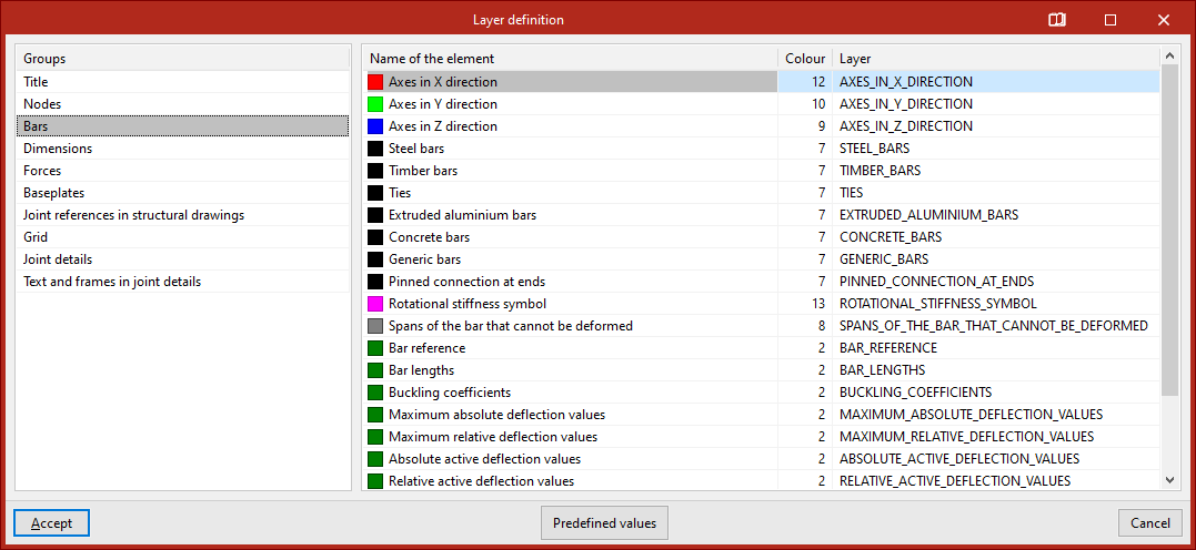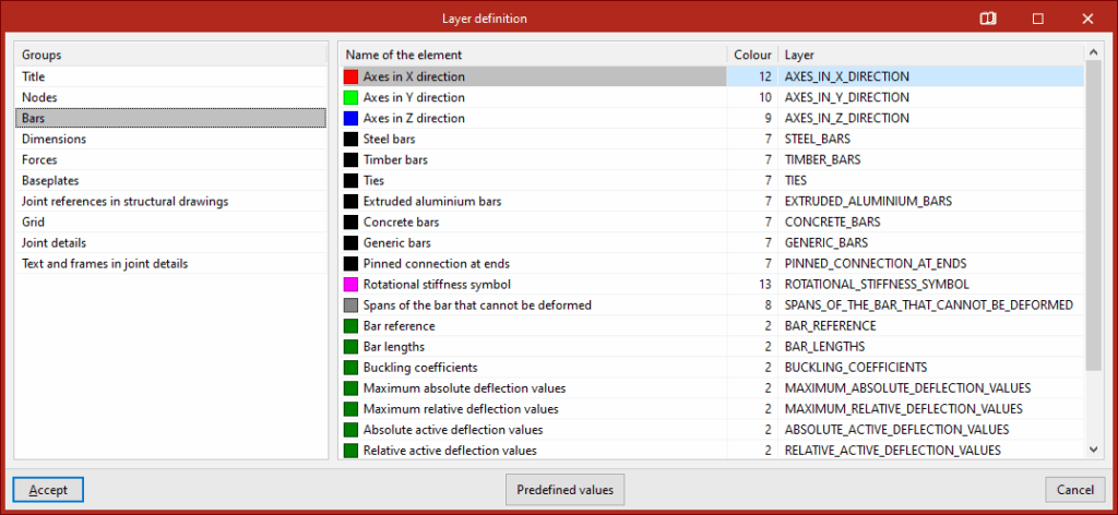 - Desde "Capas" se consulta y modifica el nombre y el número de color de las capas que se generan en todos los tipos de plano. El número de color puede estar asociado a un color diferente en cada programa de dibujo.