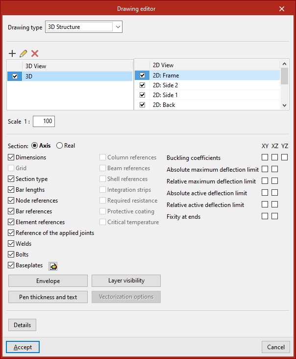 Si se elige "Estructura 3D", en la tabla central, se activa o desactiva la impresión de las diferentes vistas 3D y 2D del modelo creadas previamente desde las opciones de la pestaña "Ventana".
