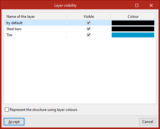 También es posible gestionar la "Visibilidad de capas" pulsando sobre el botón correspondiente. En la ventana emergente se activan o desactivan las diferentes casillas para hacer visibles cada una de las capas o los elementos contenidos en ellas. Si es de interés, se puede "Representar la estructura usando los colores de las capas".