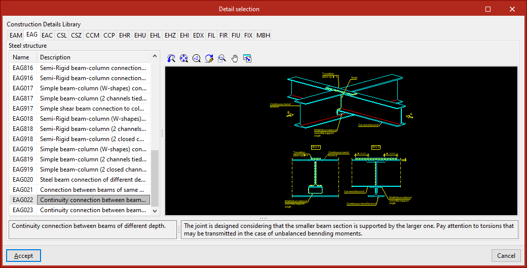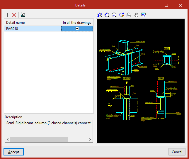 En la ventana del mismo nombre, al hacer clic en "Añadir" se puede acceder a la "Biblioteca de detalles constructivos" del programa, donde se muestran todos los detalles disponibles organizados en diferentes pestañas. Tras seleccionar un detalle, se pulsa en "Aceptar" para incorporarlo al plano. Se debe indicar si el detalle se muestra "En todos los planos" o no.