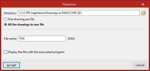Si se ha seleccionado previamente la exportación a ficheros .dxf o .dwg , el programa pedirá que se indique el "Directorio" y el "Nombre del fichero".