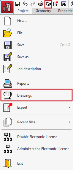 Para obtener e imprimir los planos de la obra, se abre el menú "Archivo" y se selecciona la opción "Planos", o se utiliza indistintamente el botón "Planos" de la parte superior izquierda de la interfaz general del programa.