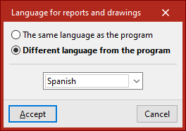 También se ofrece una herramienta para modificar el "Idioma para obtener listados y planos". Este puede ser "El mismo idioma que el programa" o un "Idioma distinto al del programa", en cuyo caso se tendrá que elegir en el desplegable.