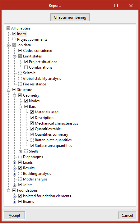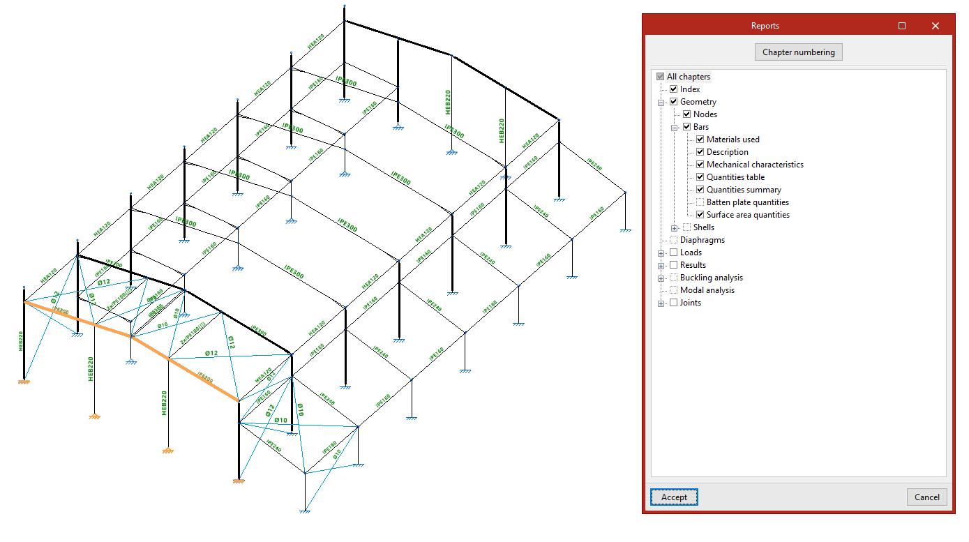 - En el capítulo "Estructura" se incluye la "Geometría" de los "Nudos", las "Barras" y las "Láminas", además de las "Cargas", los "Resultados" de cálculo y la información de las "Uniones". También incorpora información de los "Diafragmas" definidos, y el "Análisis de pandeo" y el "Análisis modal", si se han efectuado.