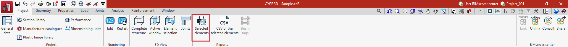 La opción "CSV de los elementos seleccionados", dentro del bloque "Listados" de la barra de herramientas superior de la pestaña "Obra", permite obtener una serie de ficheros CSV (Comma-Separated Values) con la información de datos de entrada y de los resultados de cálculo de una selección parcial de elementos que componen la estructura.