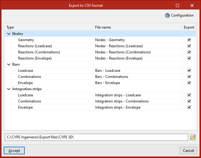 Tras confirmar con el botón derecho, el programa abre una ventana donde se puede seleccionar el "Directorio" de destino donde se alojarán los ficheros CSV generados. Por defecto, esta ruta es C:\CYPE Ingenieros\Export files\CYPE 3D.