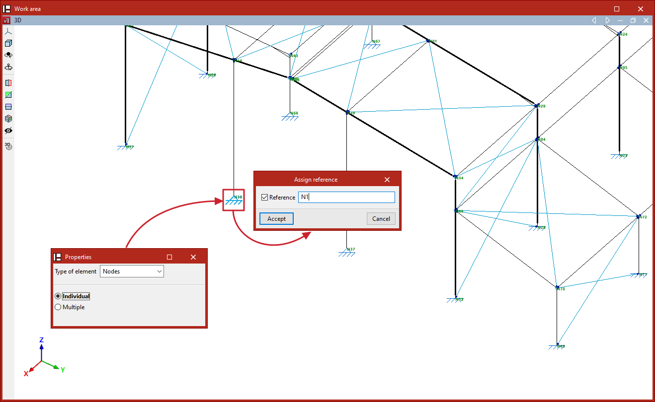 El programa crea automáticamente la referencia de los elementos en función de las opciones seleccionadas en el bloque "Numeración" de la pestaña "Obra". Para editar posteriormente la referencia de los elementos y asignarles las referencias deseadas por el usuario, se utiliza la opción "Asignar referencia" del bloque "Herramientas" de la pestaña "Geometría".