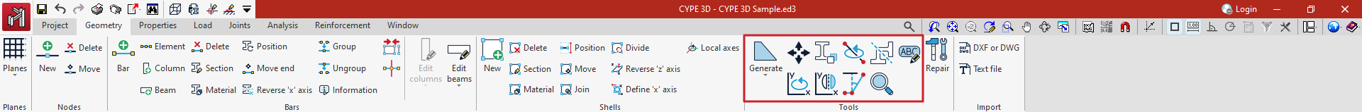 La pestaña superior "Geometría" (accesible dentro de la solapa inferior "Estructura") contiene las opciones de definición de planos de referencia e introducción de la geometría de nudos, barras y láminas en el modelo, así como varias herramientas de edición y de importación de ficheros .dwf o .dwg y ficheros de texto. Incluye lo siguiente: