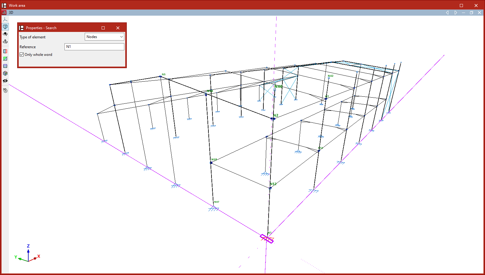 El programa mostrará en color rojo los elementos cuya referencia coincida con el texto introducido y los enmarcará con líneas de color magenta en la vista del modelo.