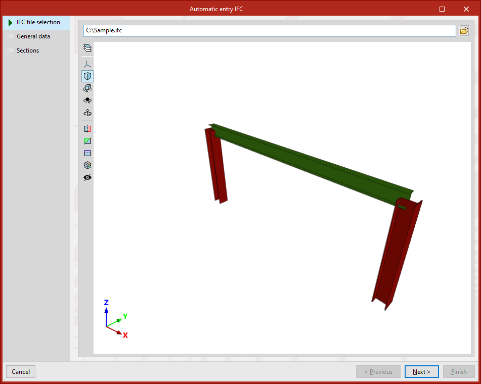 - Desde "Introducción automática IFC" es posible importar la información de ficheros IFC procedentes de otros programas que incluyan la definición del modelo analítico, a partir del cual se obtienen las vinculaciones entre barras y el esquema de su disposición. Si se selecciona esta opción, tras aceptar esta ventana se abre un asistente que guía al usuario en el proceso de importación.
