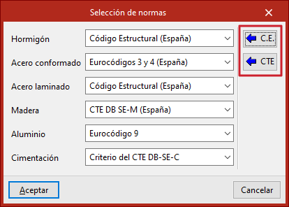 Los asistentes "C.E." y "CTE" a la derecha permiten seleccionar respectivamente los conjuntos de normas listados a continuación: