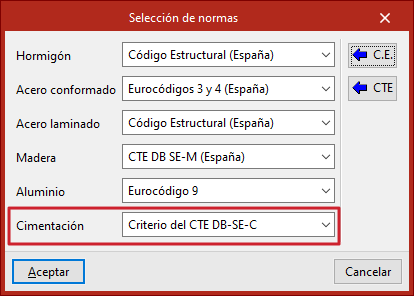 Seleccionando determinadas normativas de hormigón también aparece el desplegable "Cimentación", en el que puede indicarse qué criterio normativo se desea utilizar a efectos del cálculo de las cimentaciones.