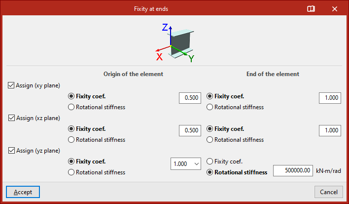 En todos estos casos, las componentes del vector perpendicular al plano aparecen ya definidas en los campos numéricos en gris. El usuario se limita a indicar si el desplazamiento o el giro en cada una de las direcciones mostradas es "Fijo" o "Elástico".