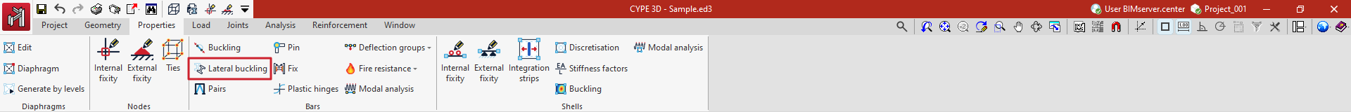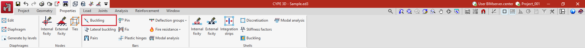 La pestaña superior "Propiedades" (accesible dentro de la solapa inferior "Estructura") contiene las opciones de definición de las propiedades de los nudos, las barras y las láminas de la estructura, así como las que permiten la definición de diafragmas rígidos. Incluye lo siguiente: