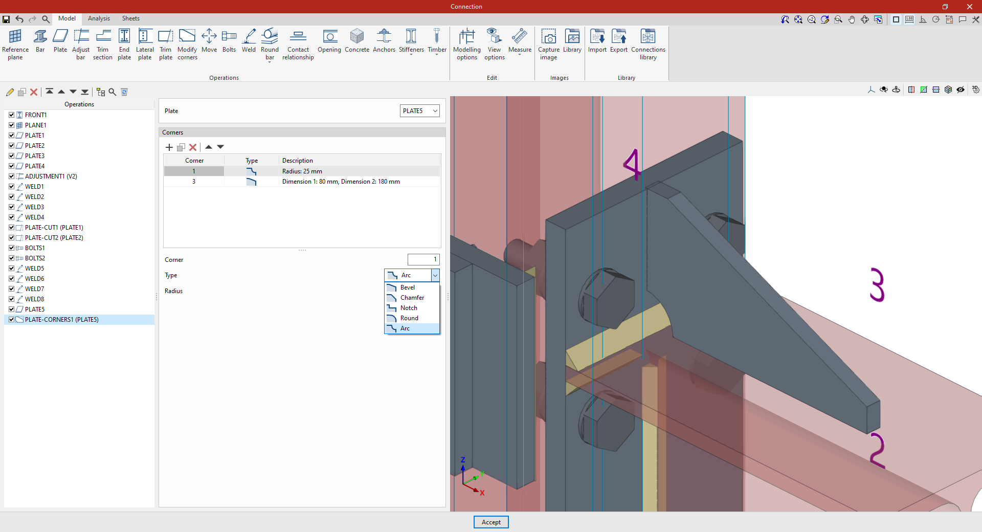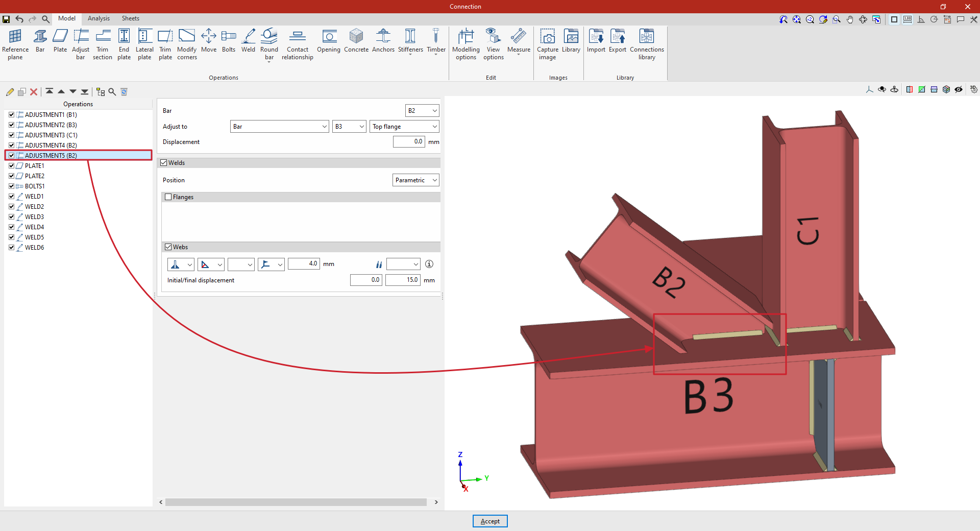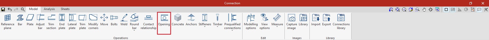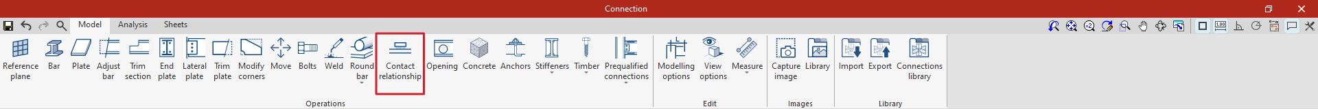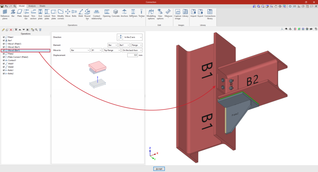 En la pestaña “Modelo” de la ventana de edición de la unión se deben especificar las “Operaciones” necesarias para definir la unión utilizando las herramientas del bloque correspondiente. Las operaciones disponibles son las siguientes:
