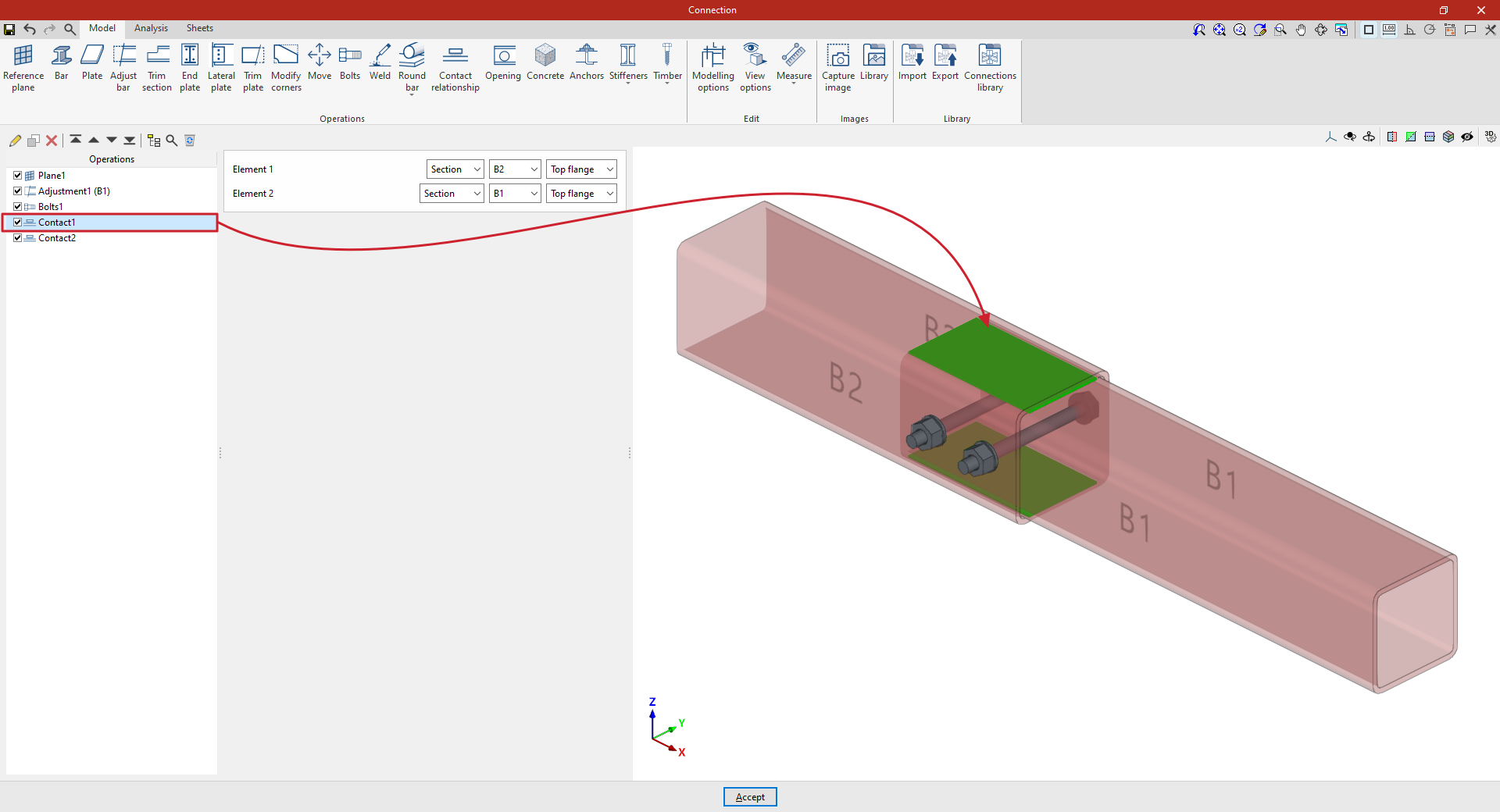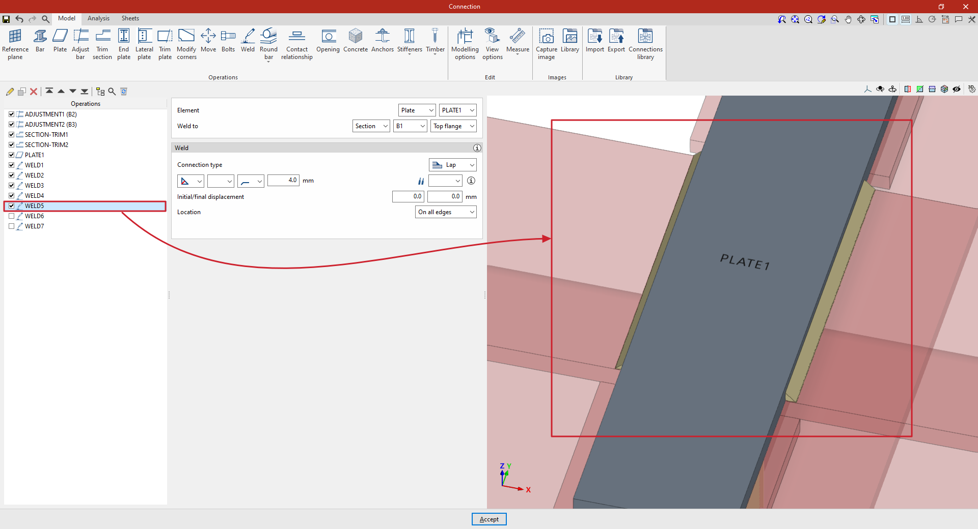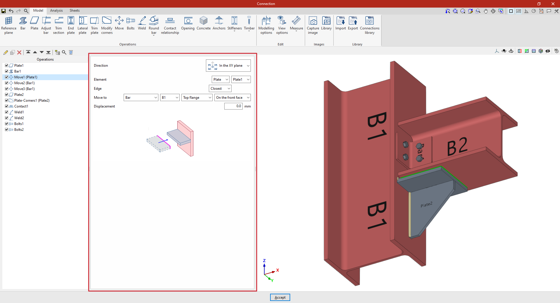 En la pestaña “Modelo” de la ventana de edición de la unión se deben especificar las “Operaciones” necesarias para definir la unión utilizando las herramientas del bloque correspondiente. Las operaciones disponibles son las siguientes: