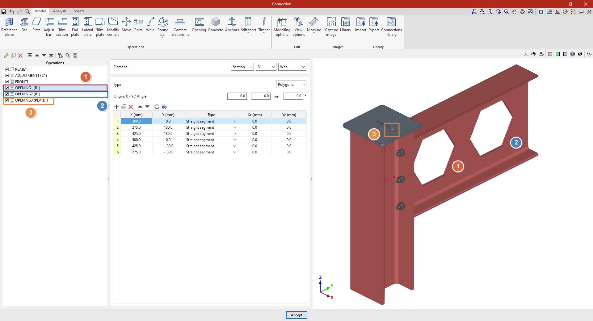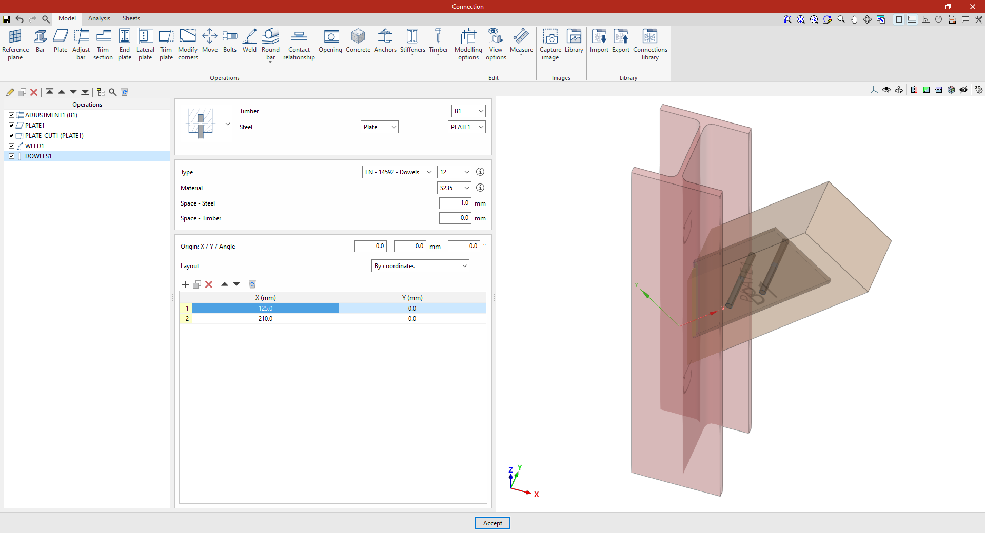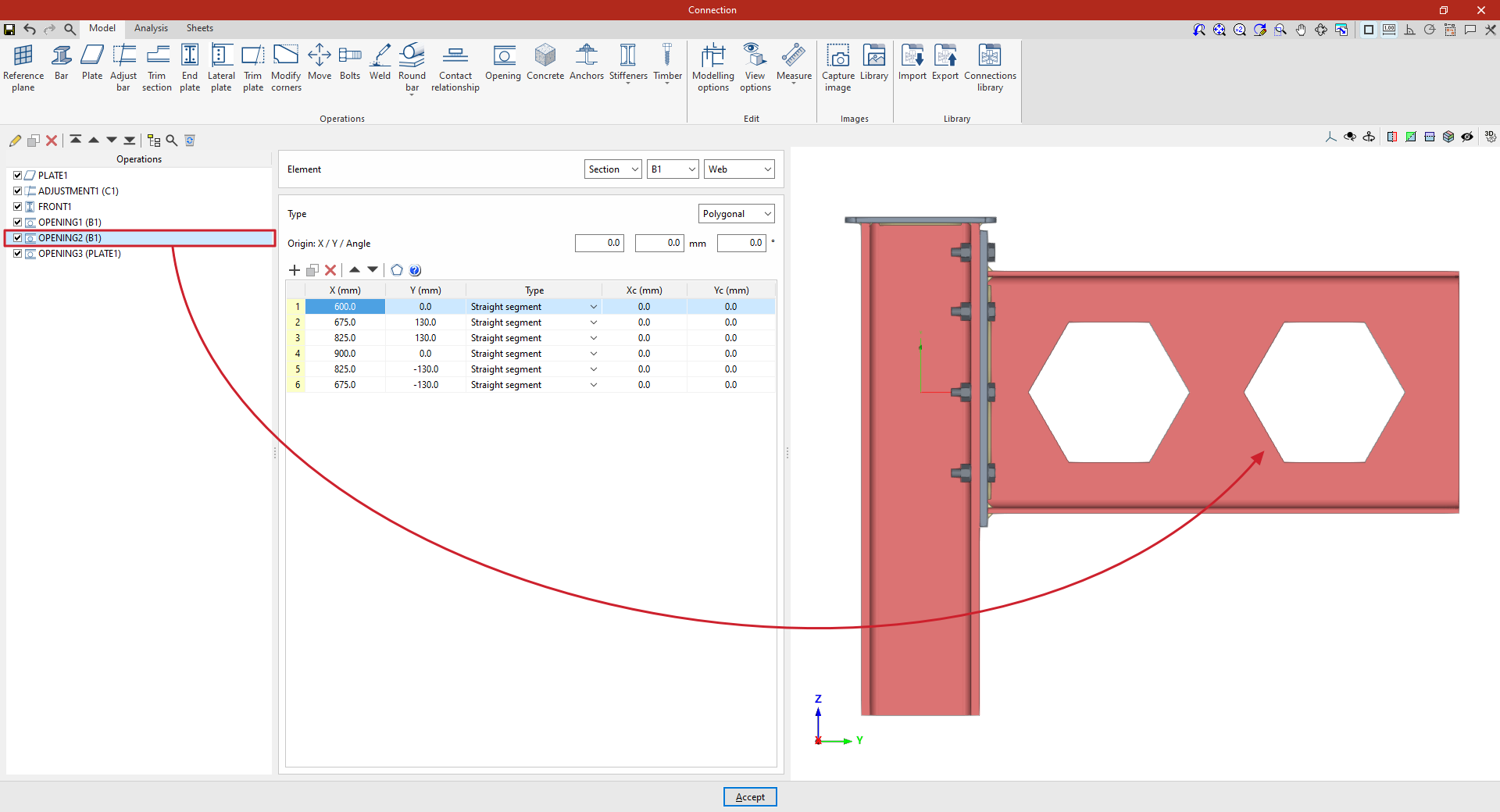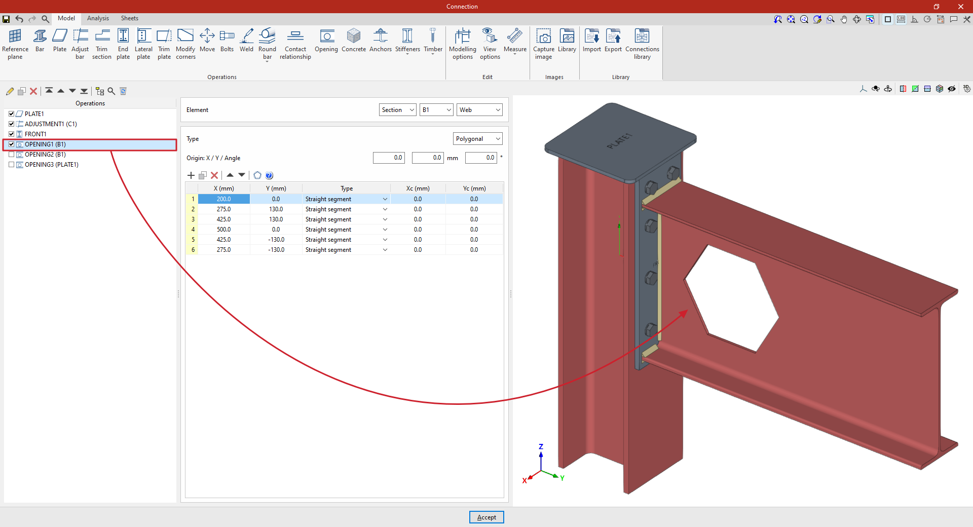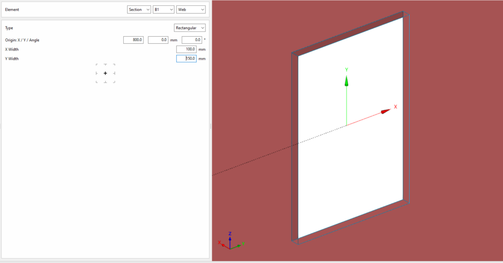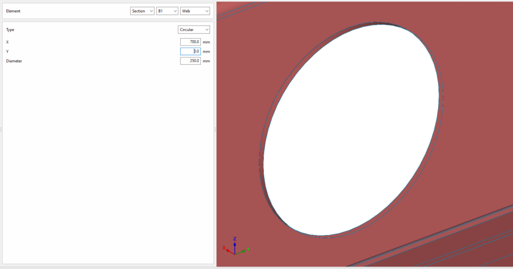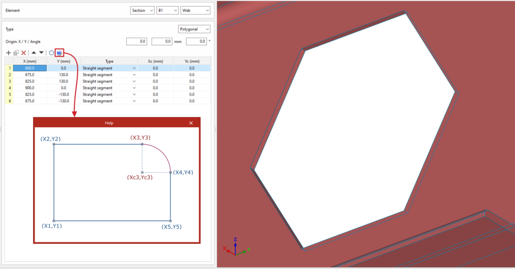 Así, se indican las distancias “X”, “Y” y “Z” del origen de coordenadas locales del perfil respecto al centro de la unión.