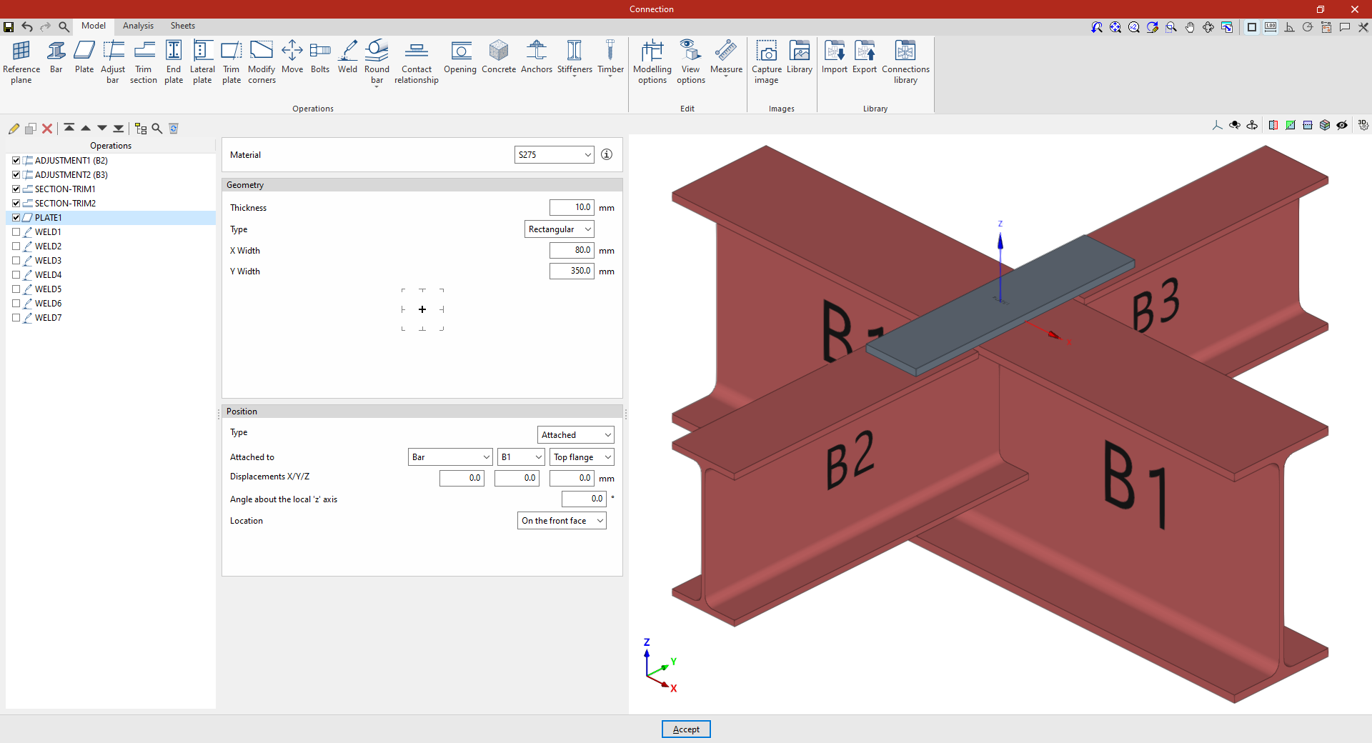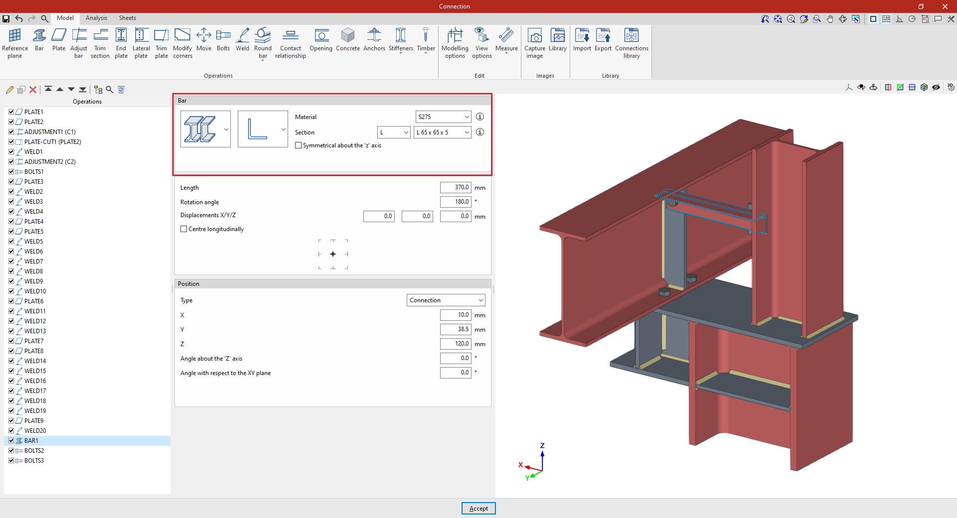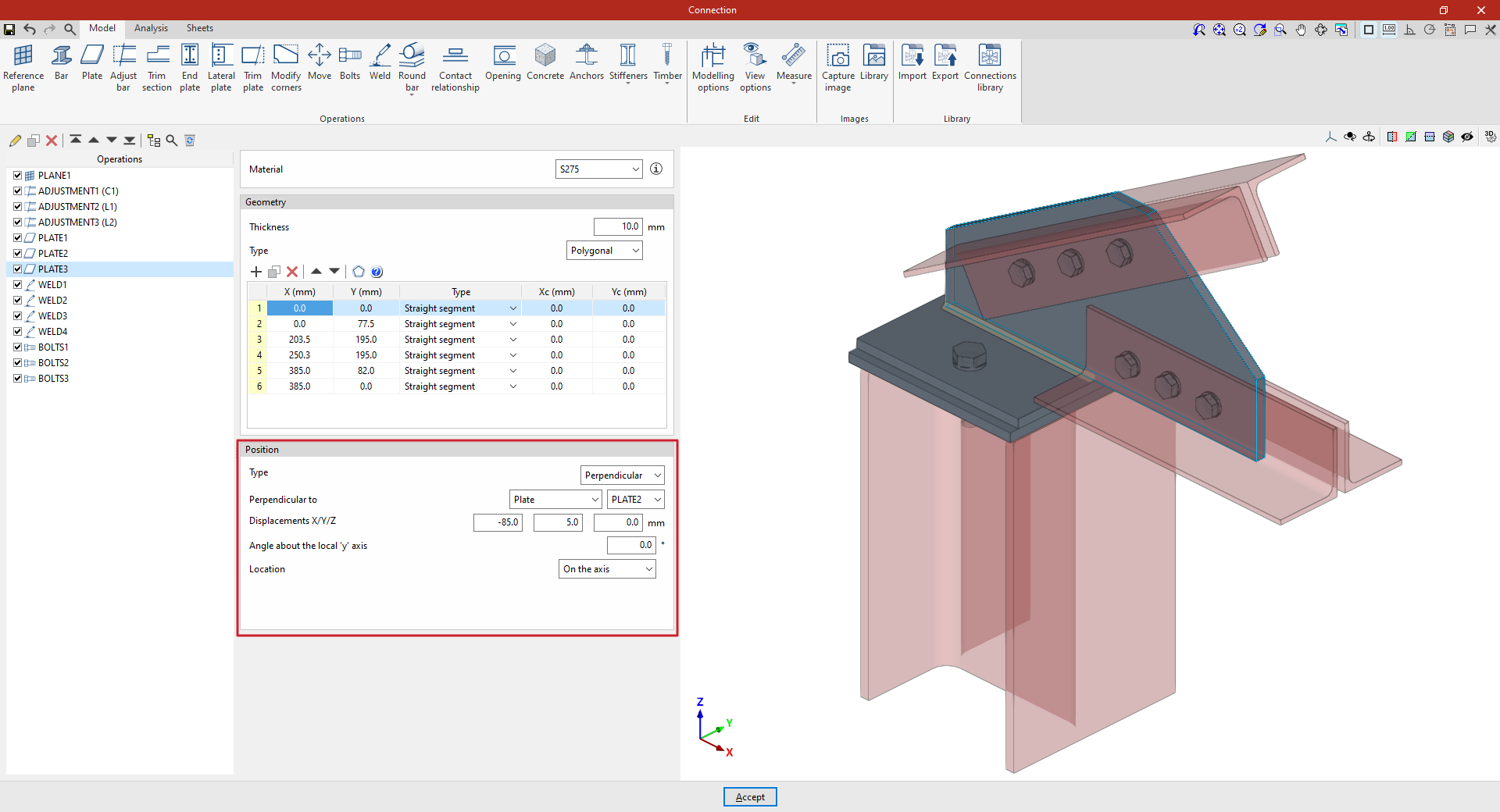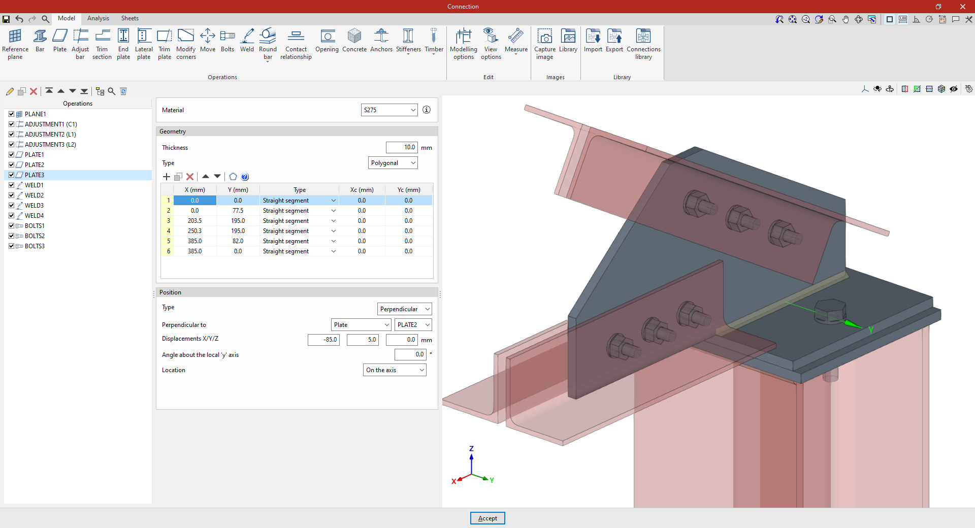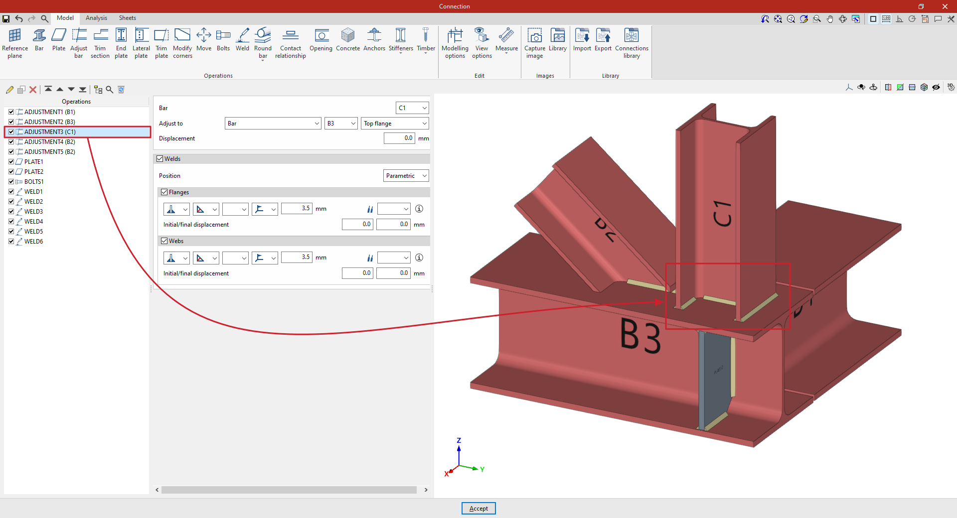 Así, se indican las distancias “X”, “Y” y “Z” del origen de coordenadas locales del perfil respecto al centro de la unión.