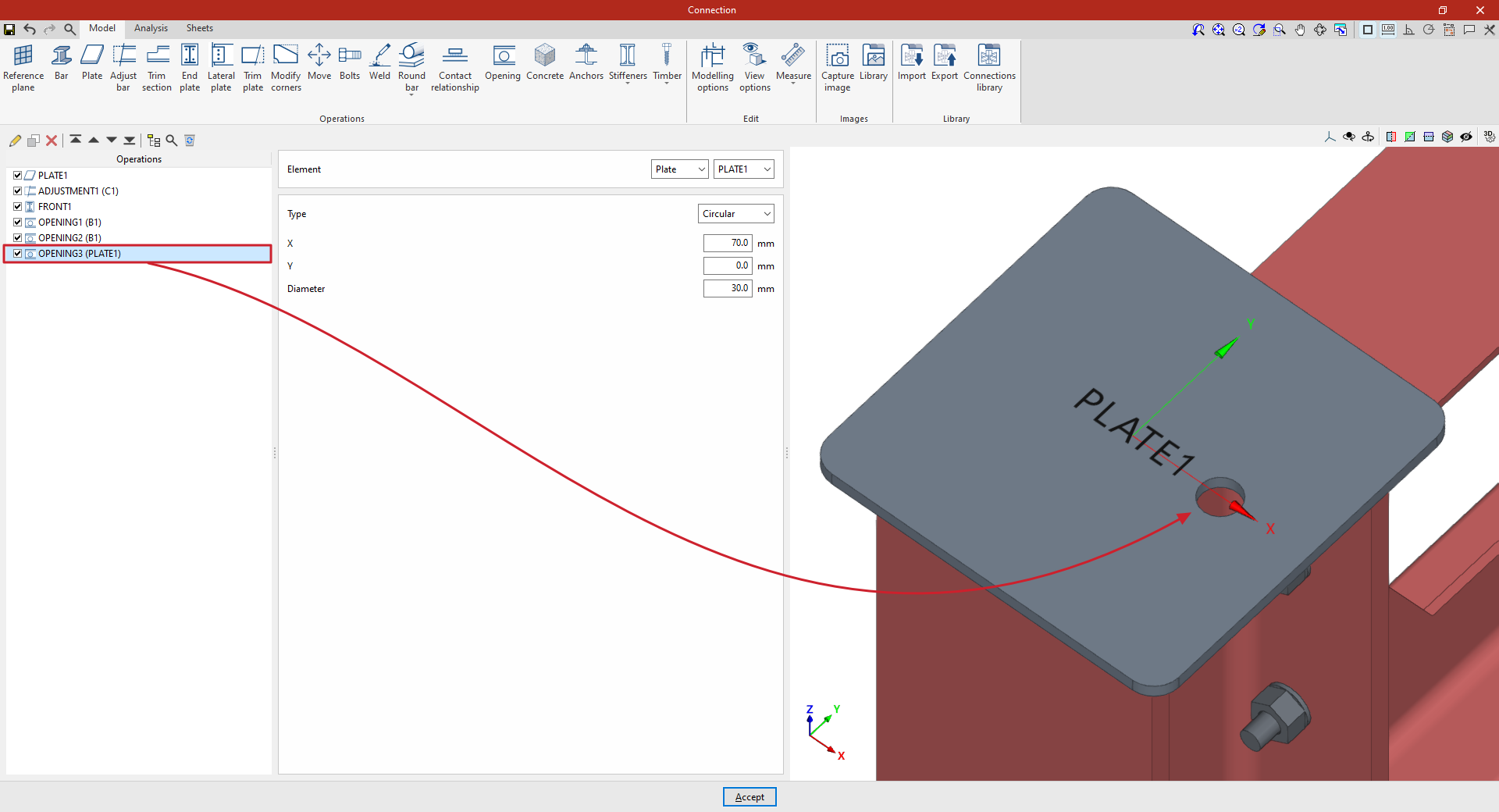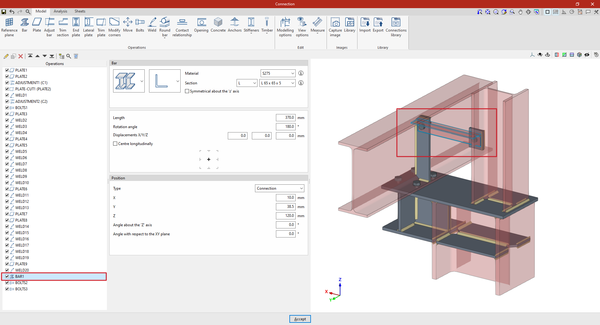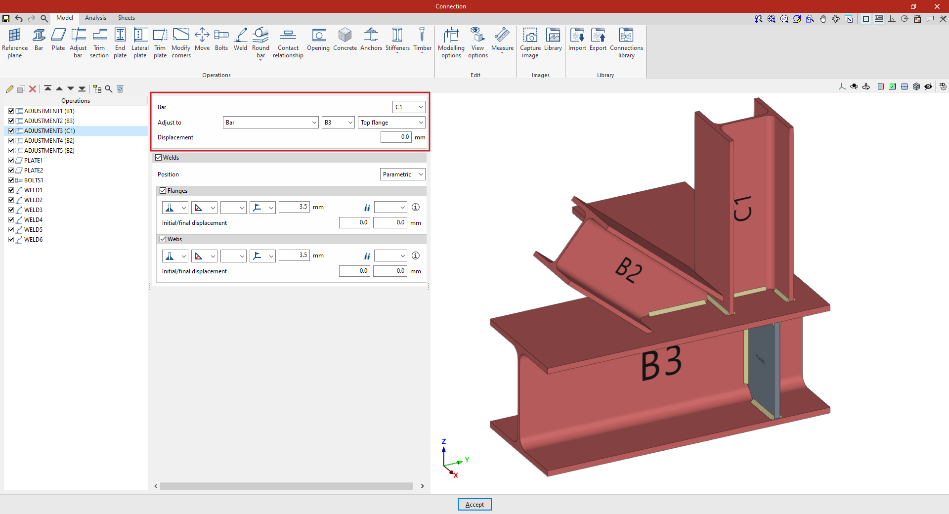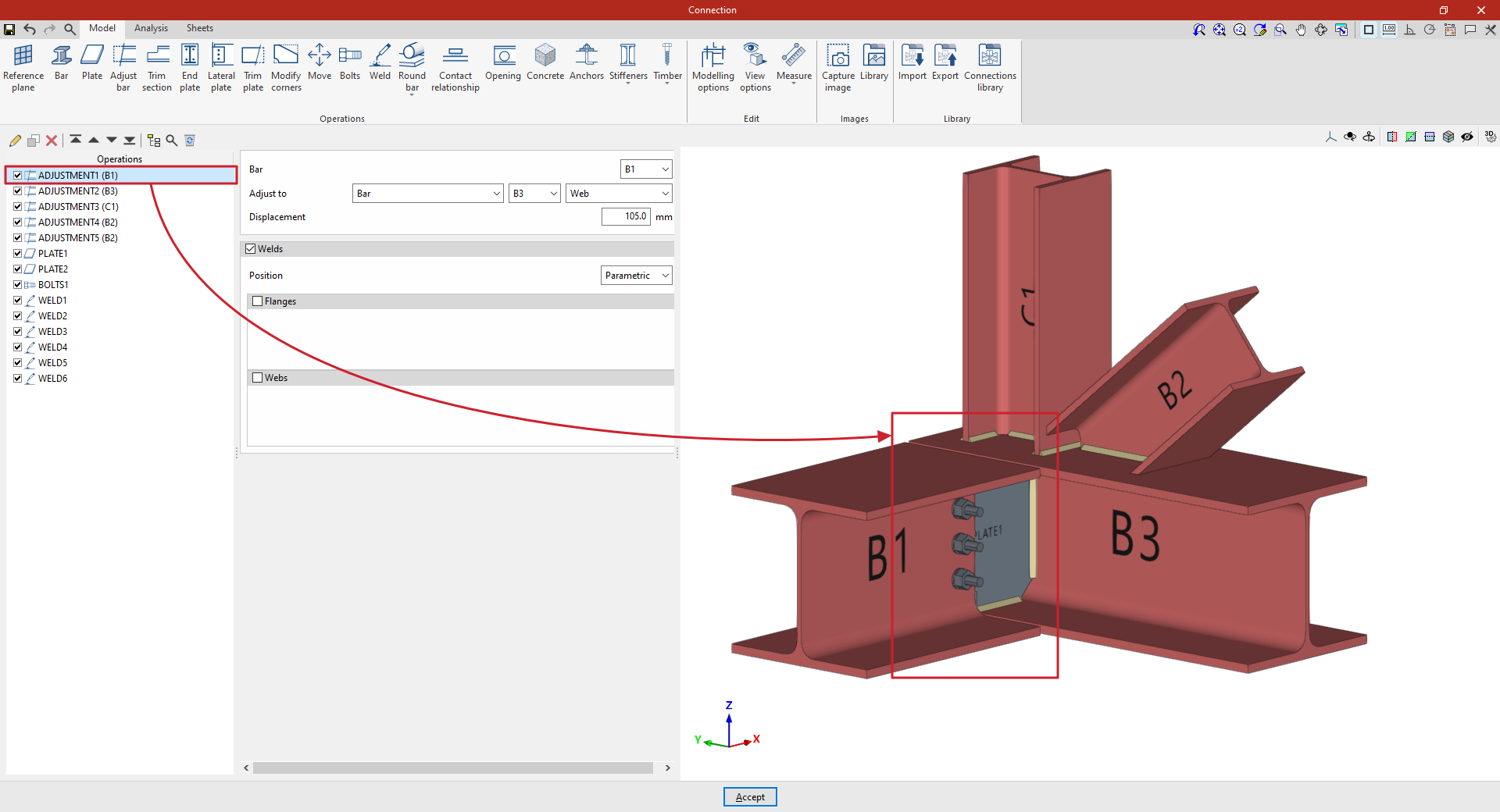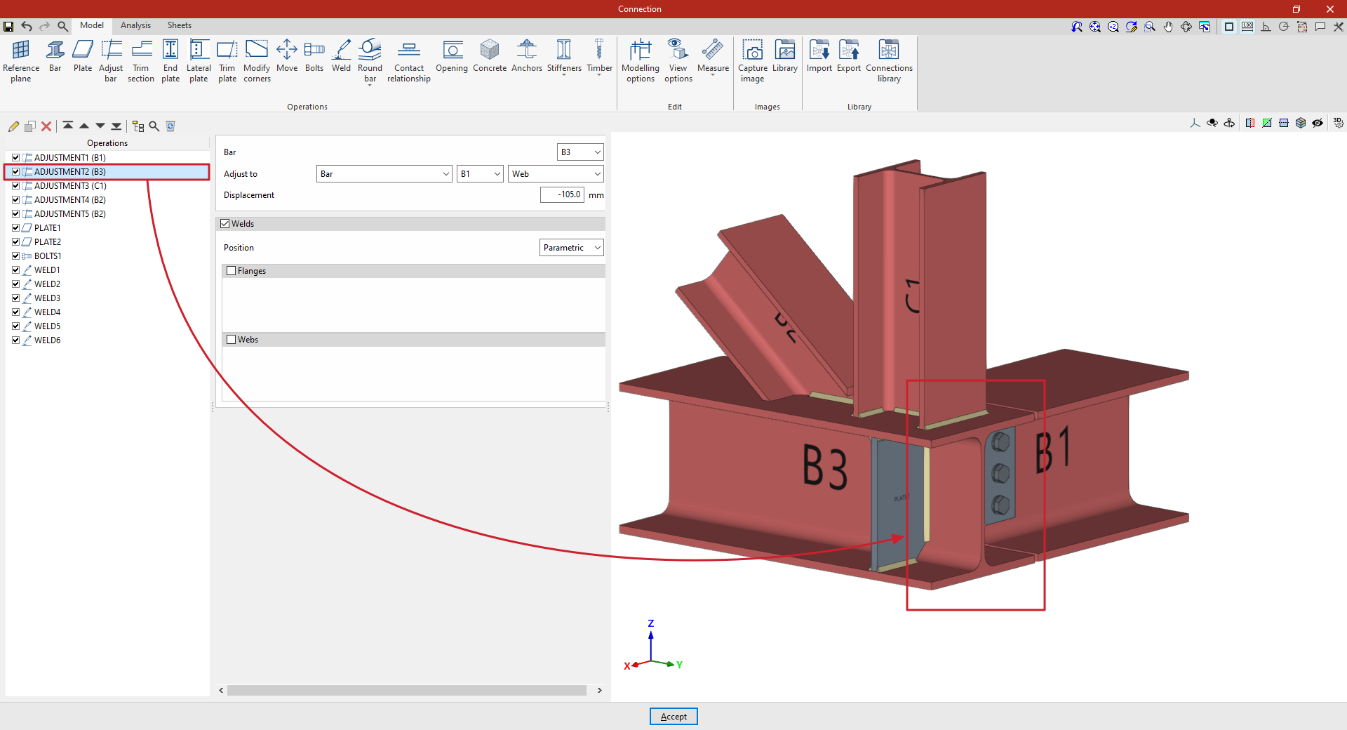 Así, se indican las distancias “X”, “Y” y “Z” del origen de coordenadas locales del perfil respecto al centro de la unión.