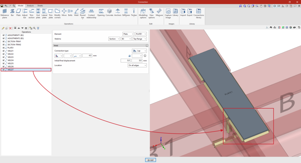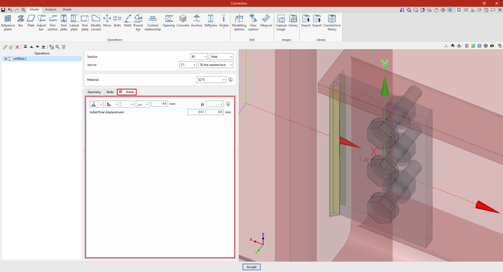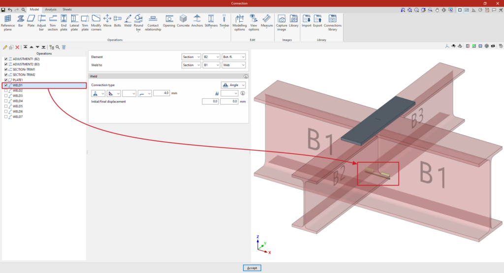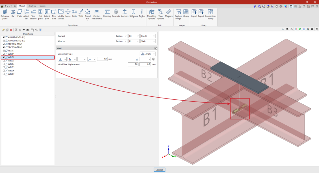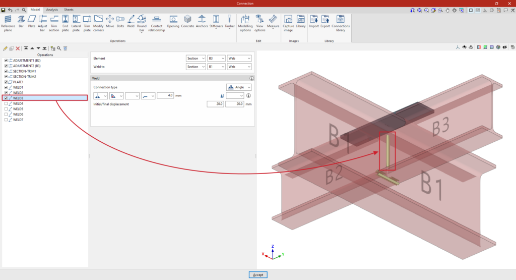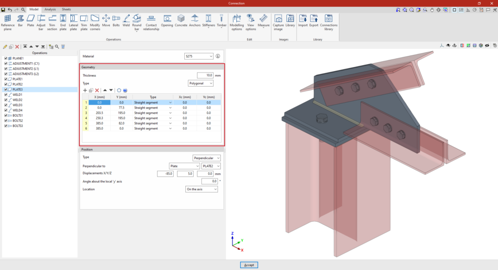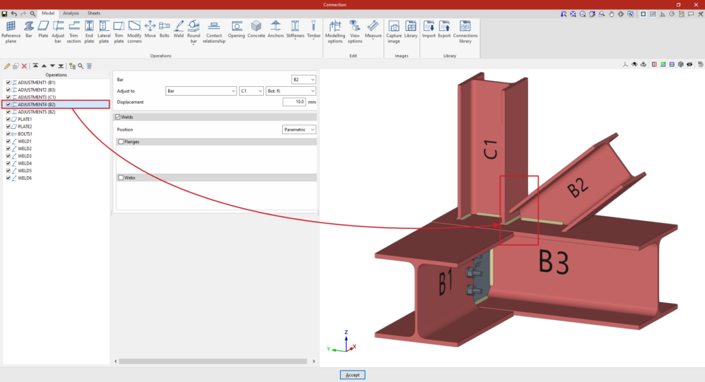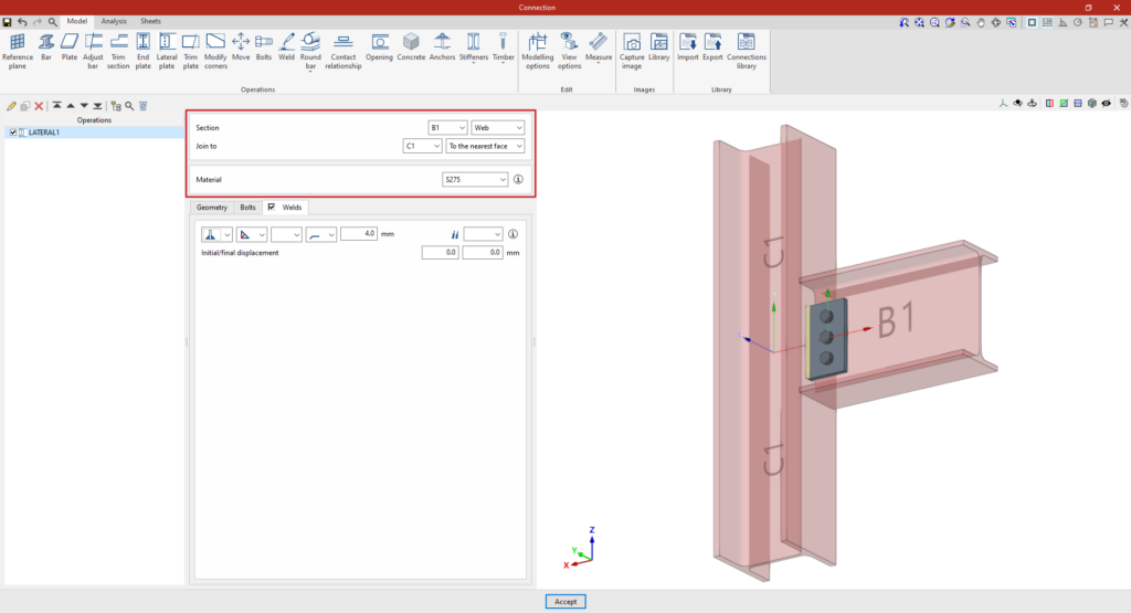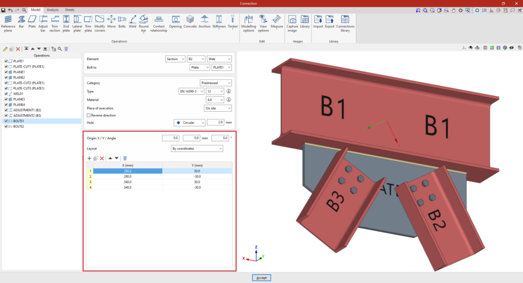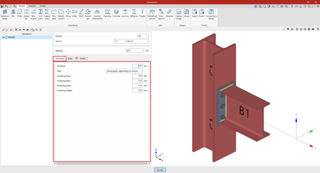 A partir de este punto, se deben añadir el resto de operaciones necesarias para completar el modelo de la unión antes de poder realizar el “Cálculo” de la misma en la pestaña correspondiente.