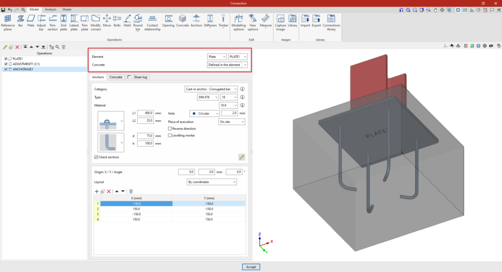 La herramienta "Placa" permite generar placas rectangulares y poligonales e insertarlas en el modelo de la unión. Las placas poligonales pueden definirse a partir de coordenadas, y es posible copiar y pegar tablas directamente desde hojas de cálculo.