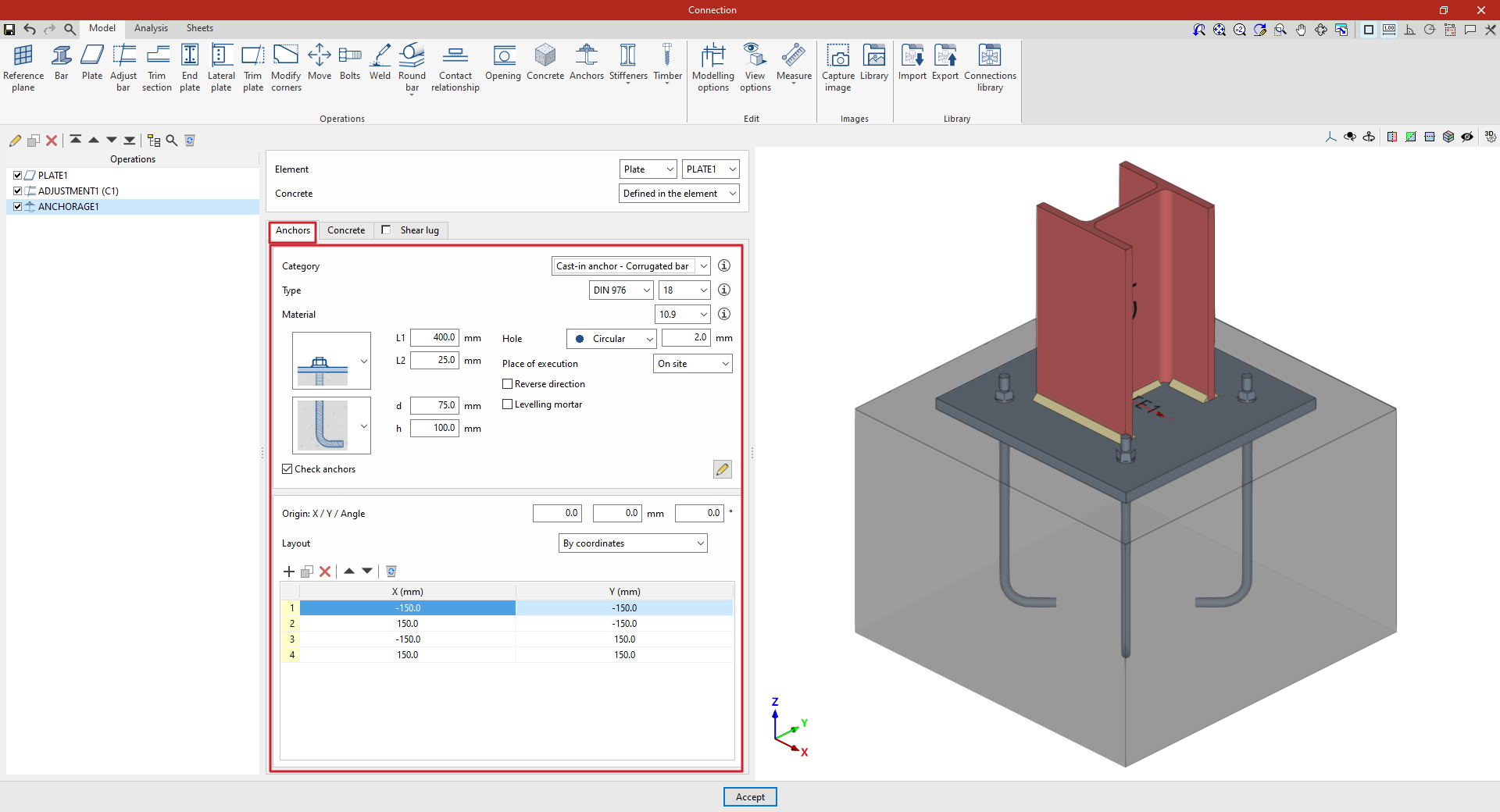 - Es necesario definir las coordenadas X e Y locales y el ángulo del origen de posicionamiento de los pernos en la placa o barra introduciendo estos datos en los campos "Origen: X / Y / Ángulo".