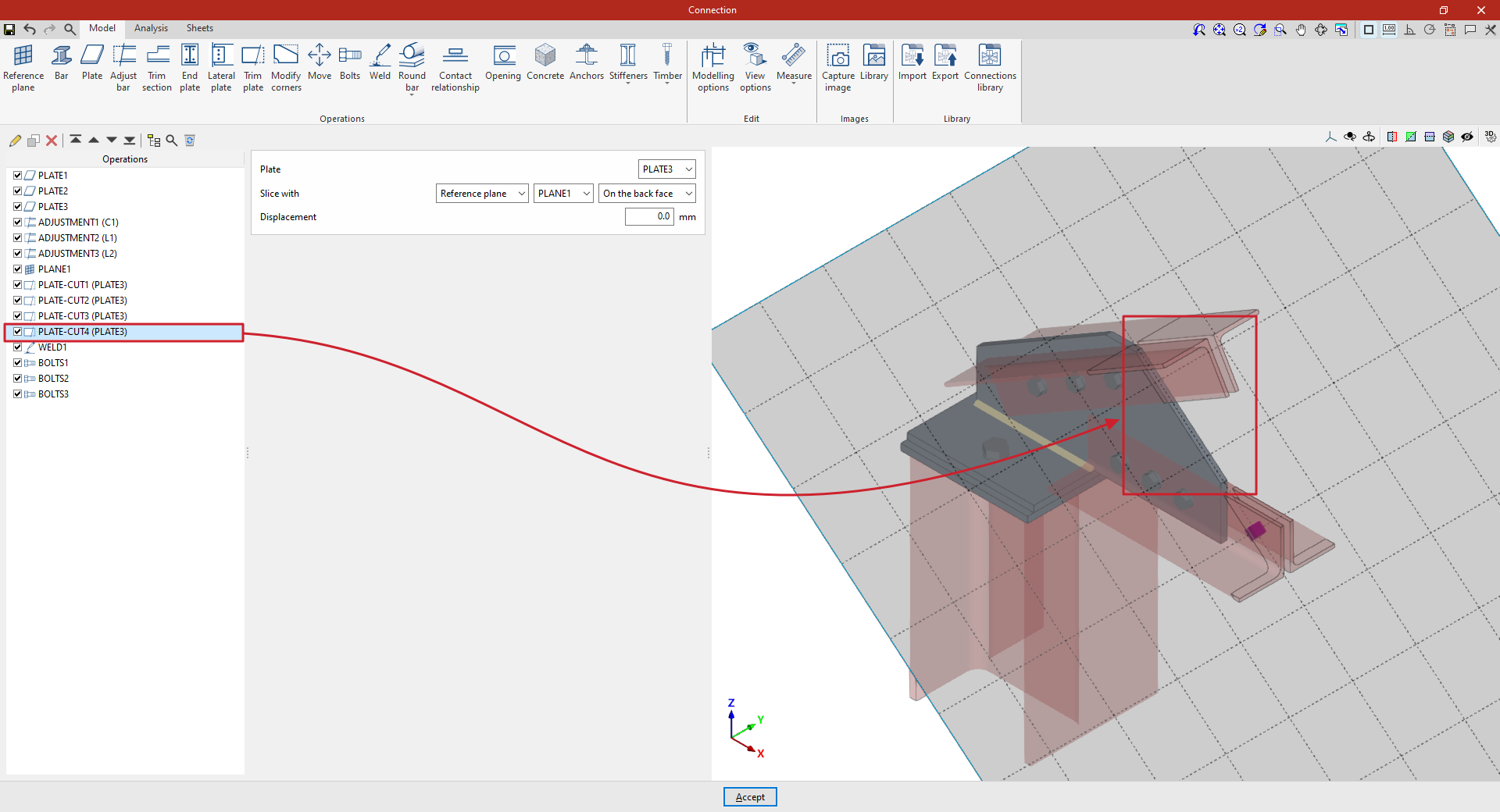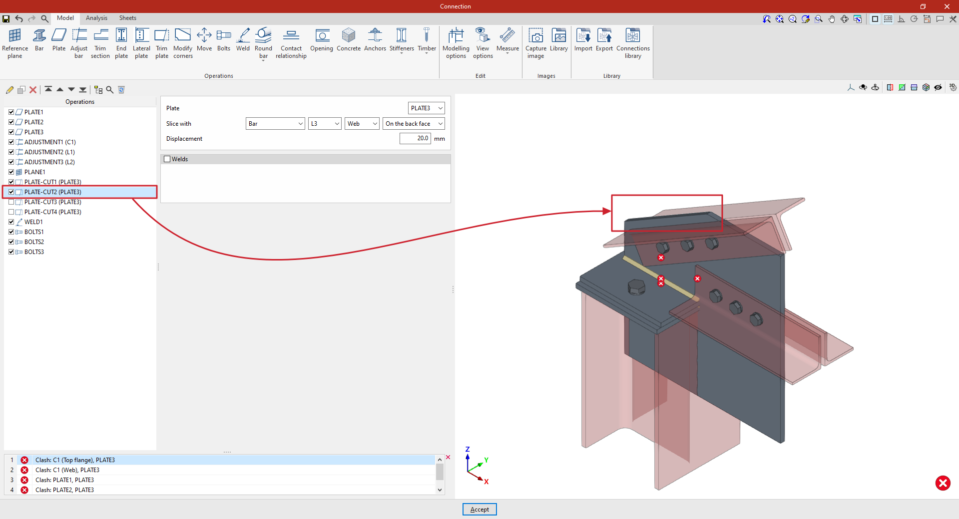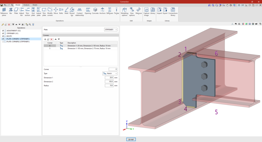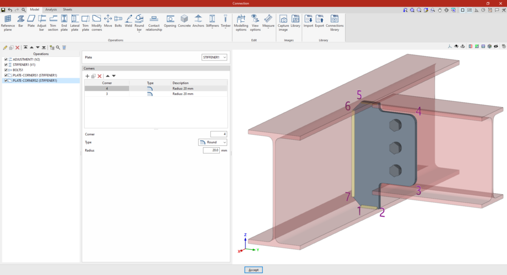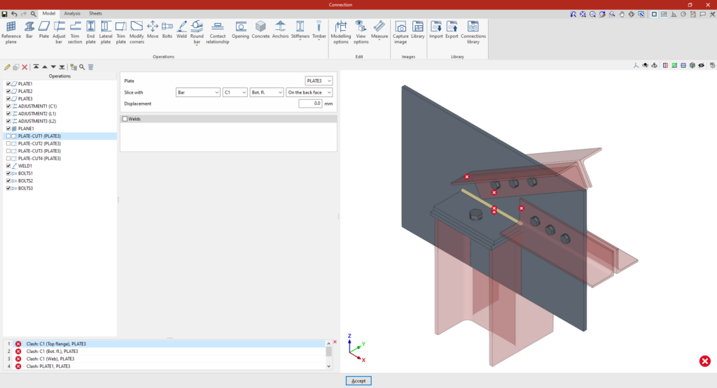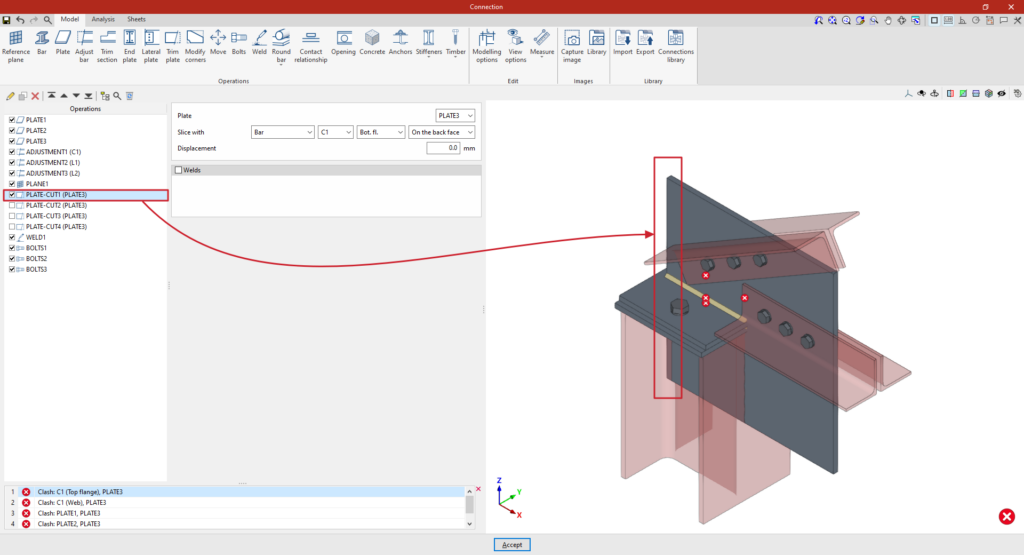 | Tras crear el plano de referencia, se puede utilizar en otras opciones como “Ajustar perfil” y “Recortar placa”, o para definir la posición de una “Placa” o un elemento de “Hormigón”. Por ejemplo, se puede definir la “Posición” por “Ángulos” y añadir posteriormente un recorte de placa que utilice el “Plano de referencia” introducido. De esta forma, se completa el modelo de la unión. A partir de aquí, se puede realizar el “Cálculo” de la misma en la pestaña para este fin. |