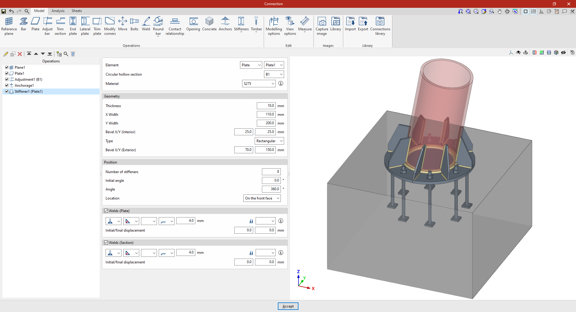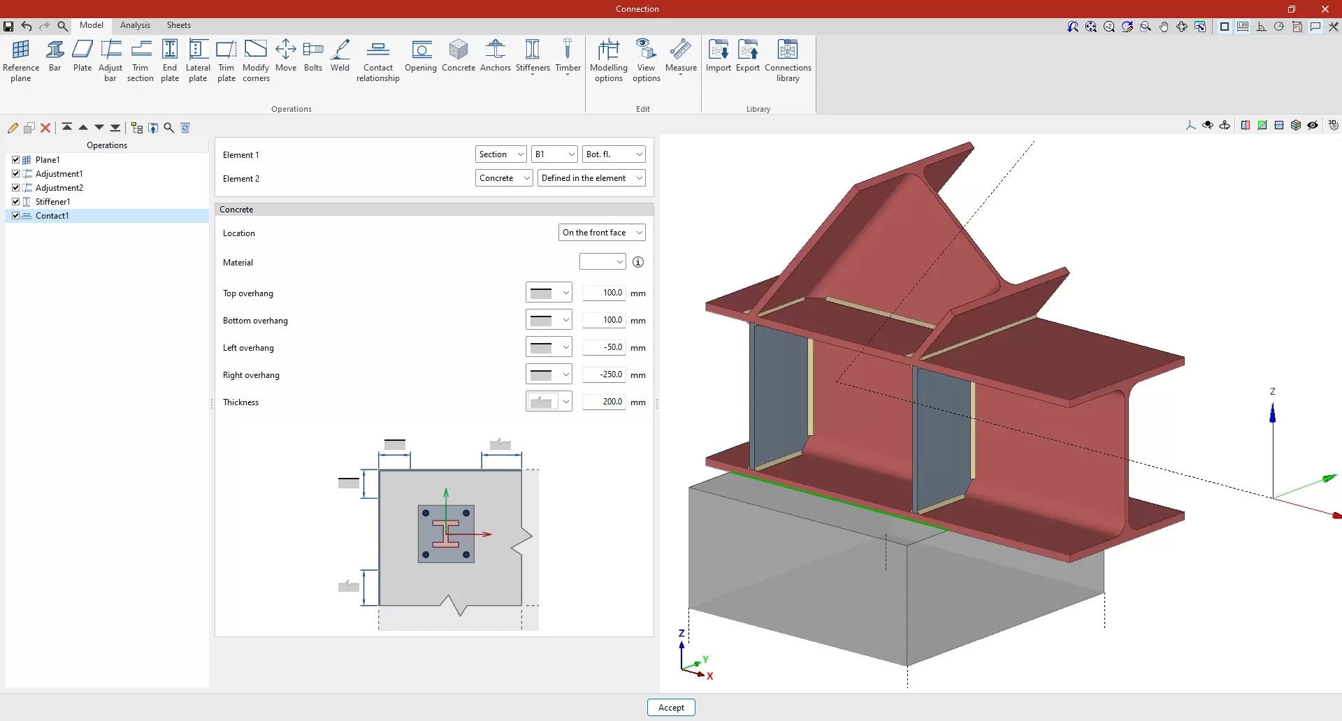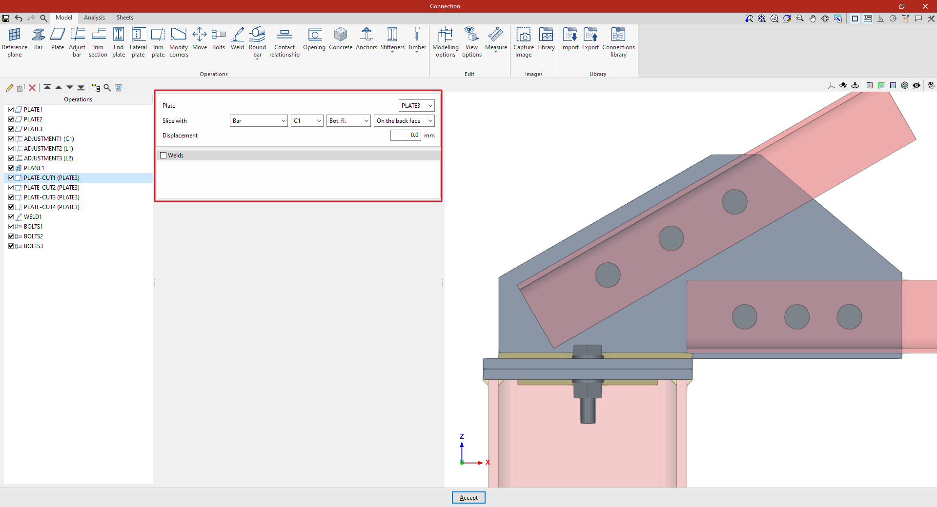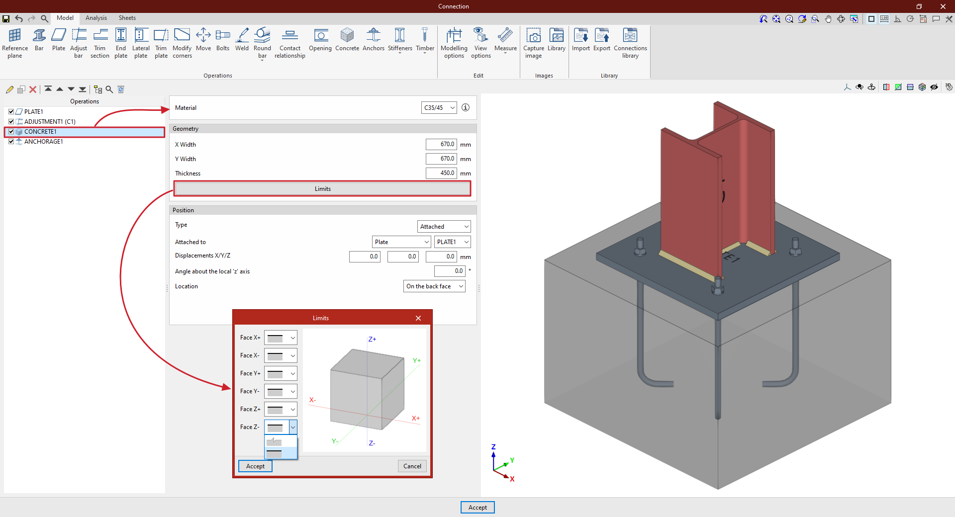 | Tras crear el plano de referencia, se puede utilizar en otras opciones como “Ajustar perfil” y “Recortar placa”, o para definir la posición de una “Placa” o un elemento de “Hormigón”. Por ejemplo, se puede definir la “Posición” por “Ángulos” y añadir posteriormente un recorte de placa que utilice el “Plano de referencia” introducido. De esta forma, se completa el modelo de la unión. A partir de aquí, se puede realizar el “Cálculo” de la misma en la pestaña para este fin. |
