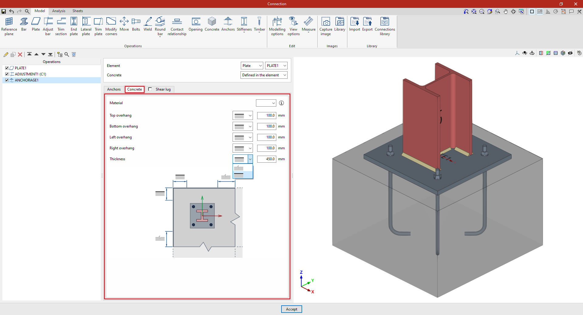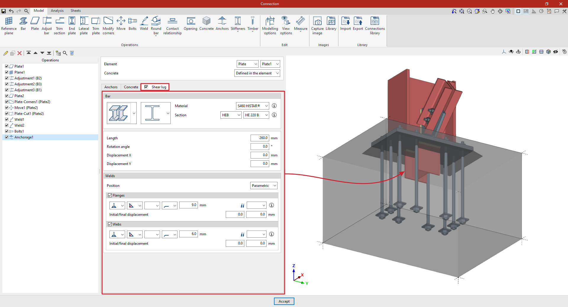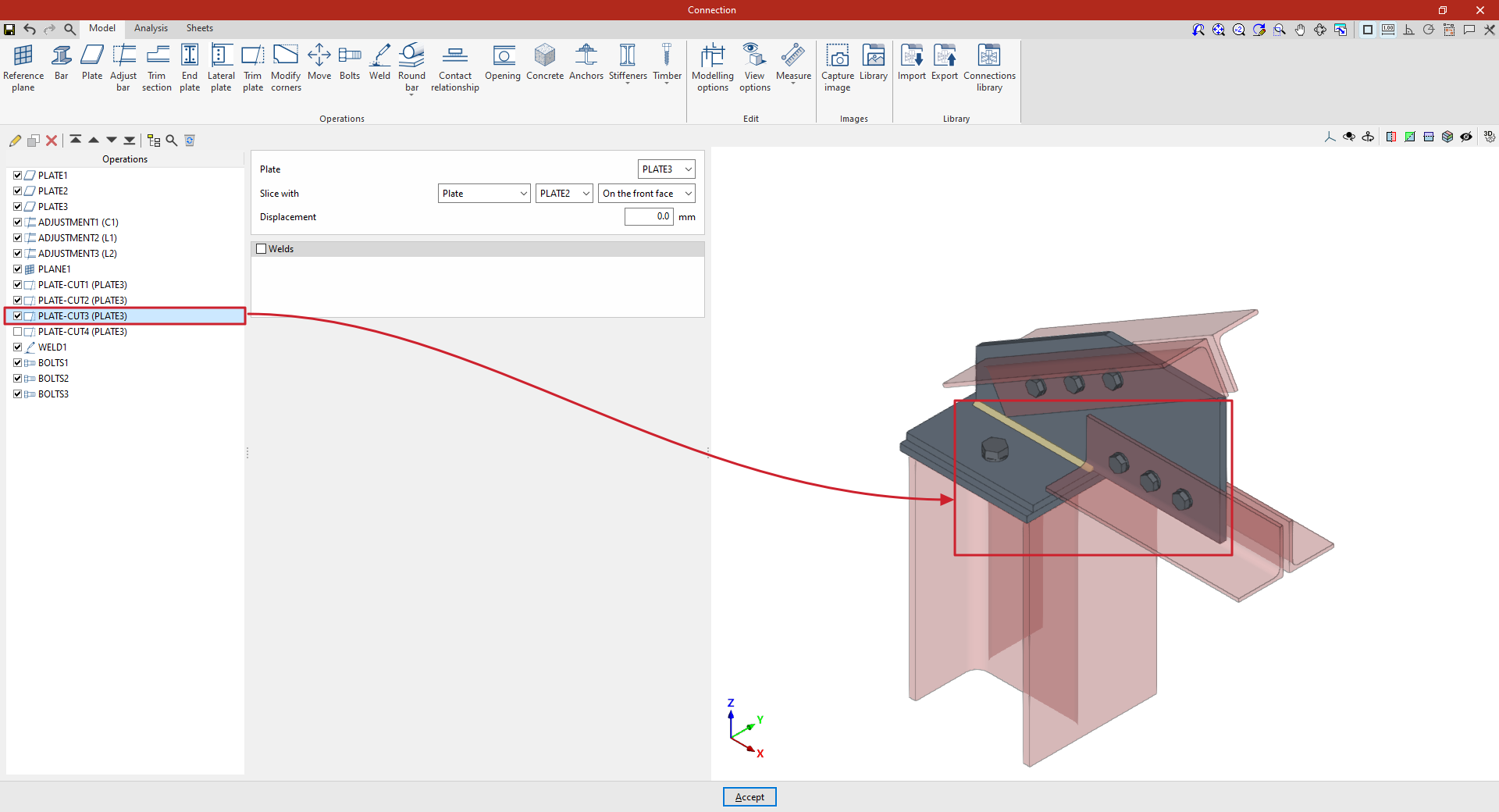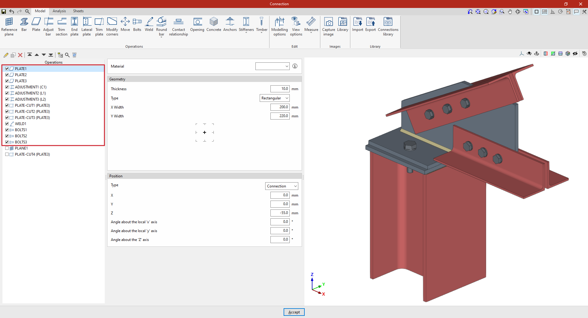 | Tras crear el plano de referencia, se puede utilizar en otras opciones como “Ajustar perfil” y “Recortar placa”, o para definir la posición de una “Placa” o un elemento de “Hormigón”. Por ejemplo, se puede definir la “Posición” por “Ángulos” y añadir posteriormente un recorte de placa que utilice el “Plano de referencia” introducido. De esta forma, se completa el modelo de la unión. A partir de aquí, se puede realizar el “Cálculo” de la misma en la pestaña para este fin. |
