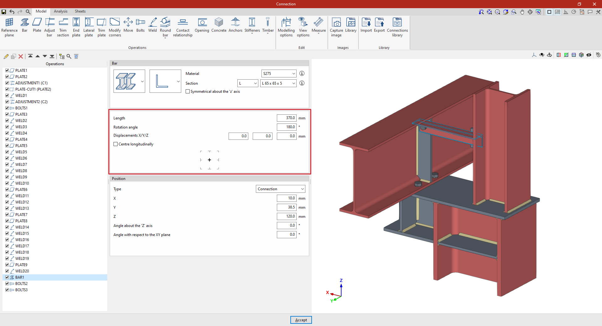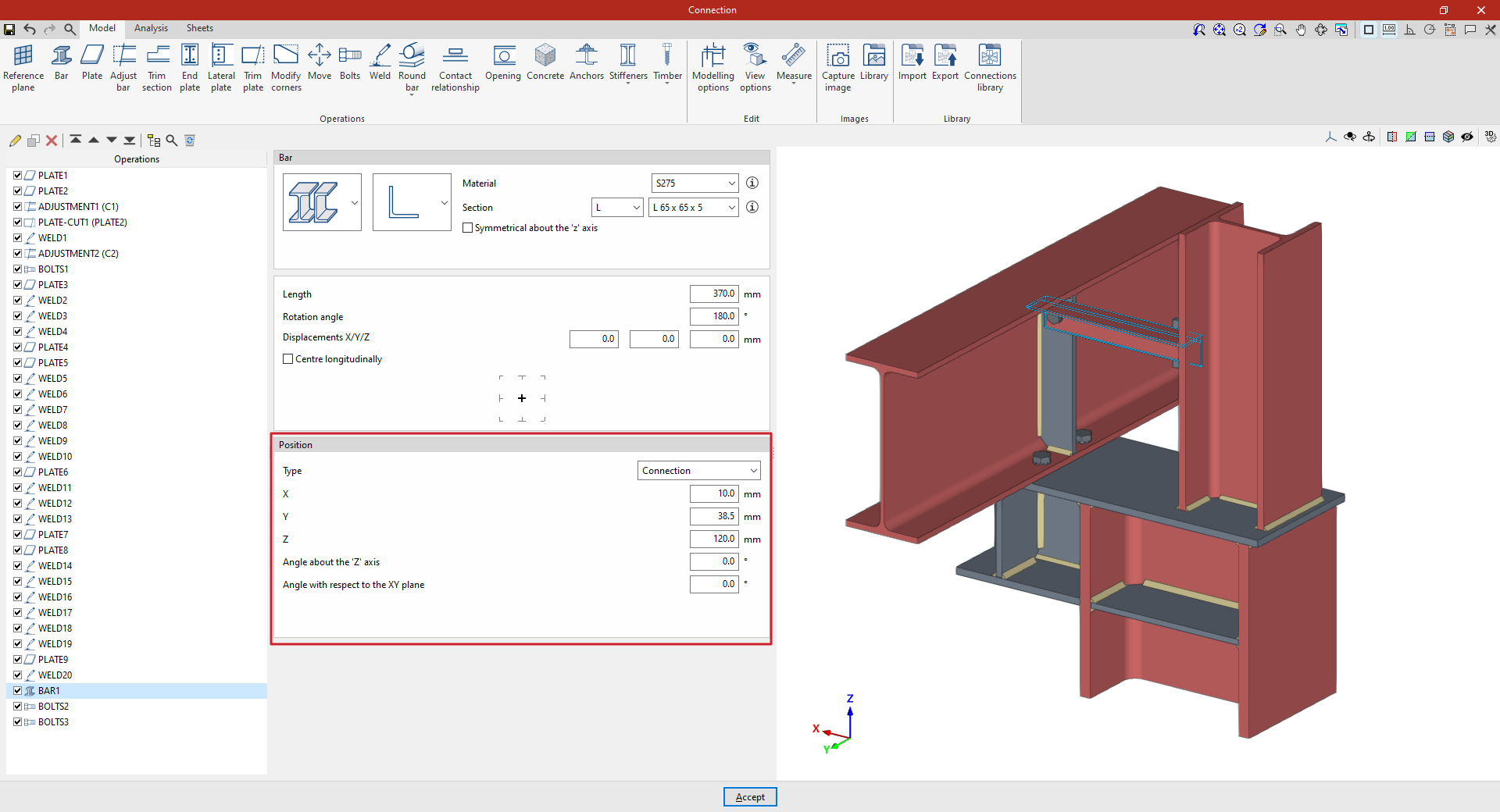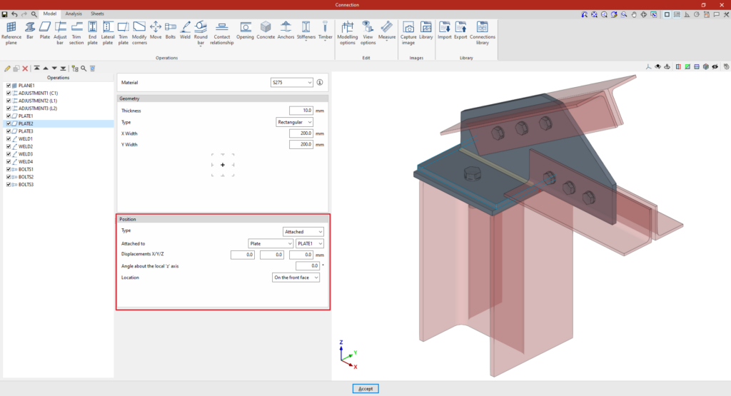 Para definir la “Posición” se puede declarar que el plano de referencia se sitúa en la “Intersección” entre una barra y una de las placas de otra barra.