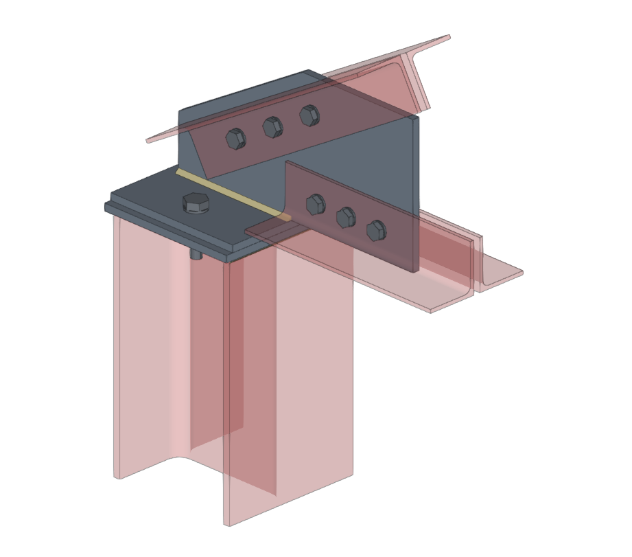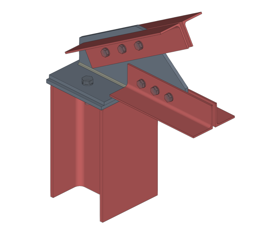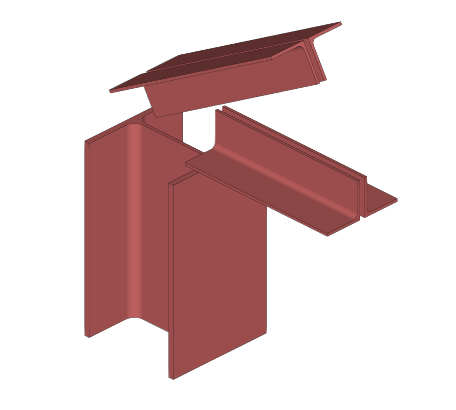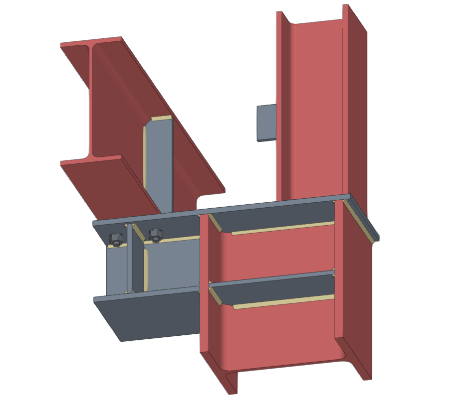 | En el ejemplo aquí mostrado, se han introducido placas, tornillos y soldaduras, y se han realizado operaciones de ajuste sobre los perfiles de la unión y recortes en las placas. Para completar la unión, se puede introducir un plano de referencia que se podrá usar posteriormente para introducir el último recorte sobre una de las placas del modelo. |