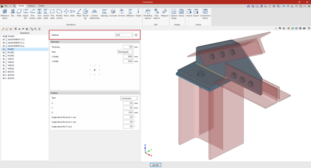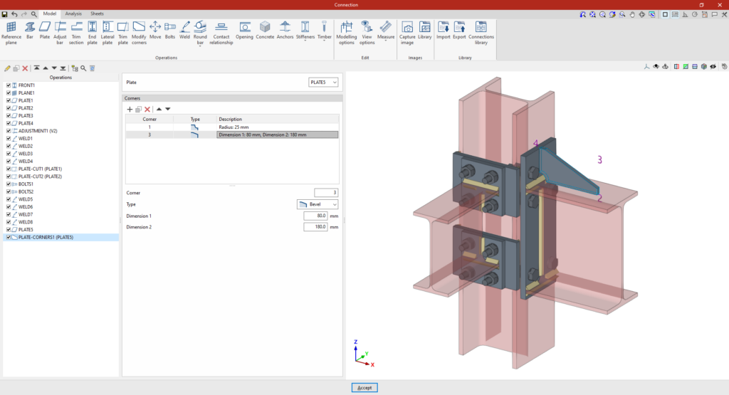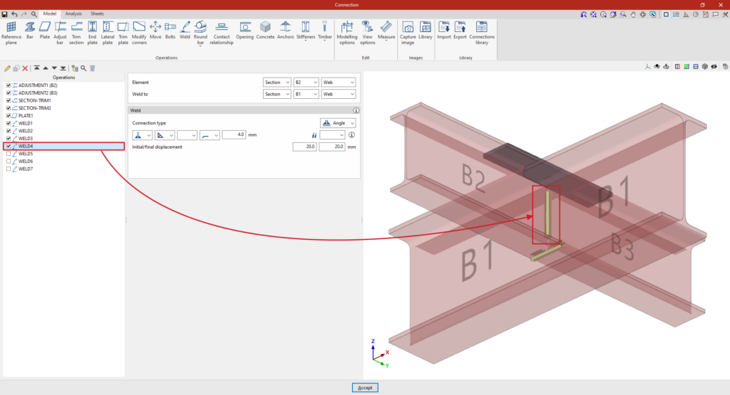 El programa permite la definición detallada de los componentes de cada conexión precalificada en el panel de edición de la operación.
