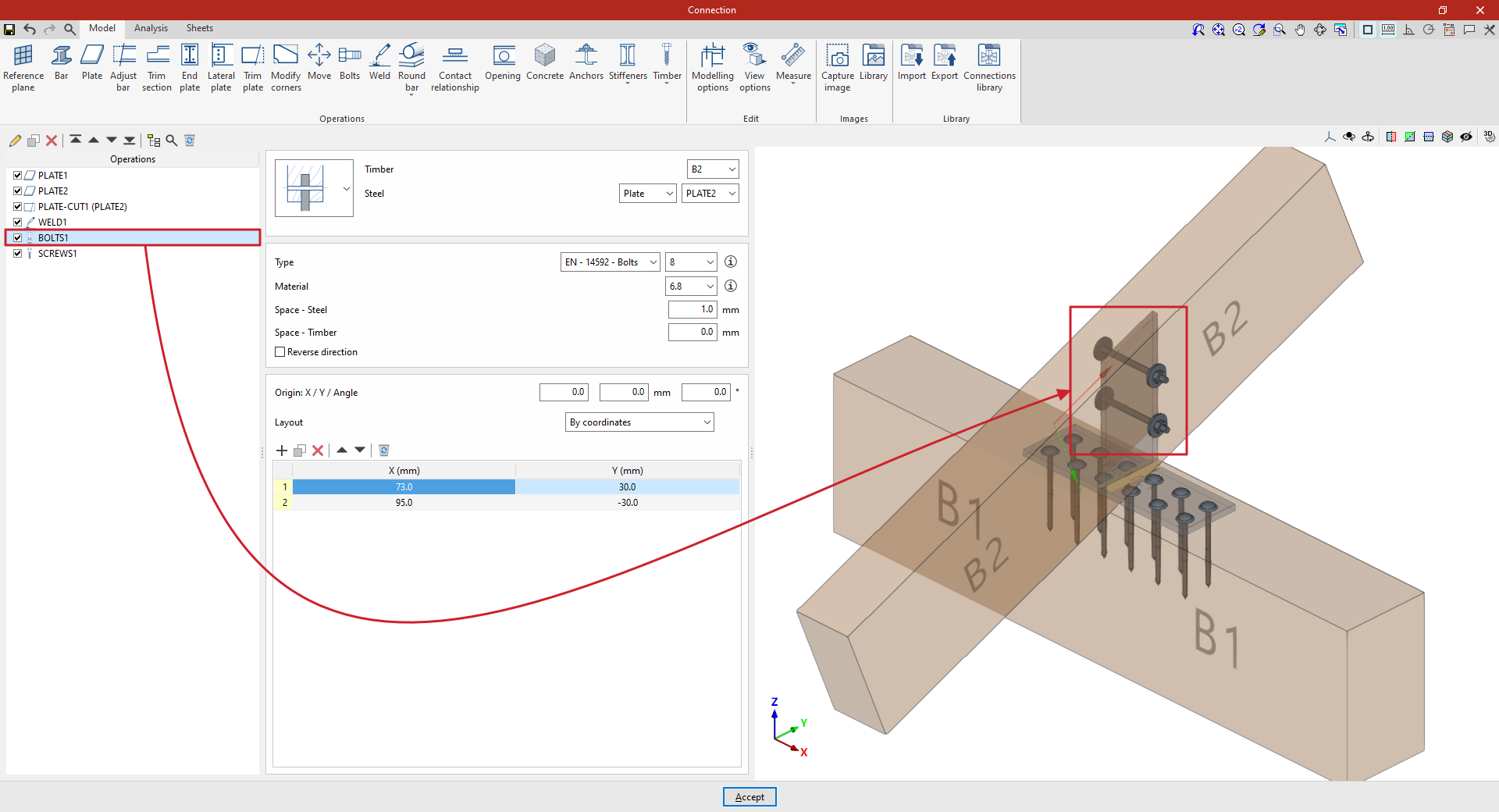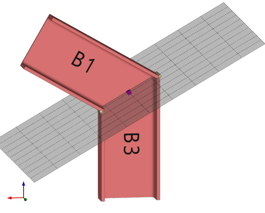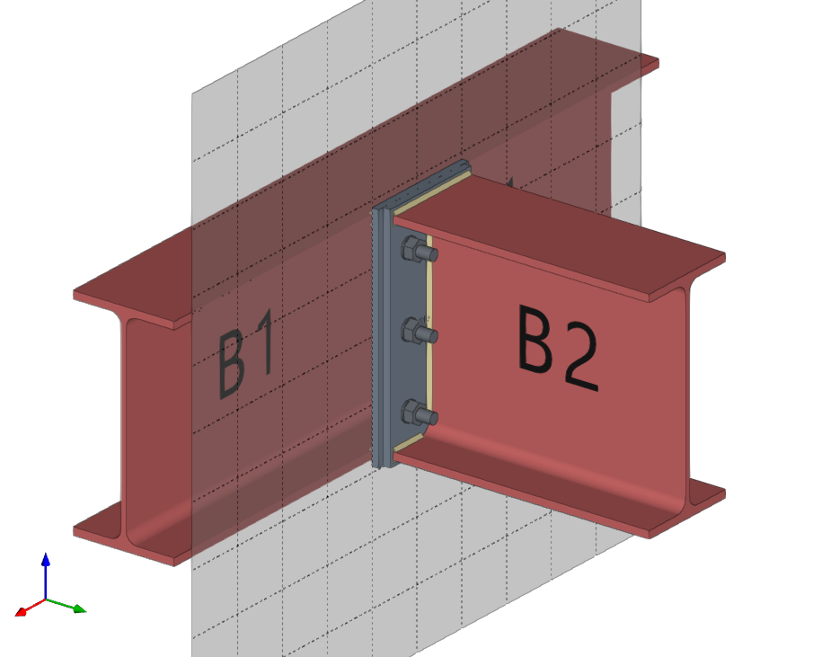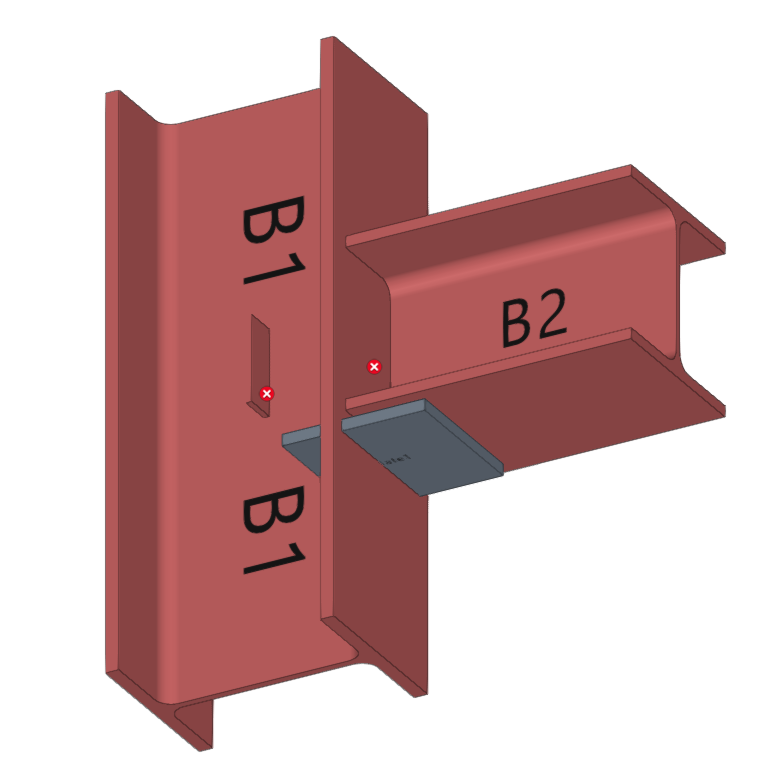 | En este ejemplo, se desea resolver una unión entre dos piezas de madera. Previamente, se ha introducido una placa sobre la viga principal B1. Posteriormente, se ha añadido una segunda placa perpendicular y soldada a la primera. A continuación, se introducen los pernos que permiten resolver la unión entre esta placa y la viga secundaria B2. |