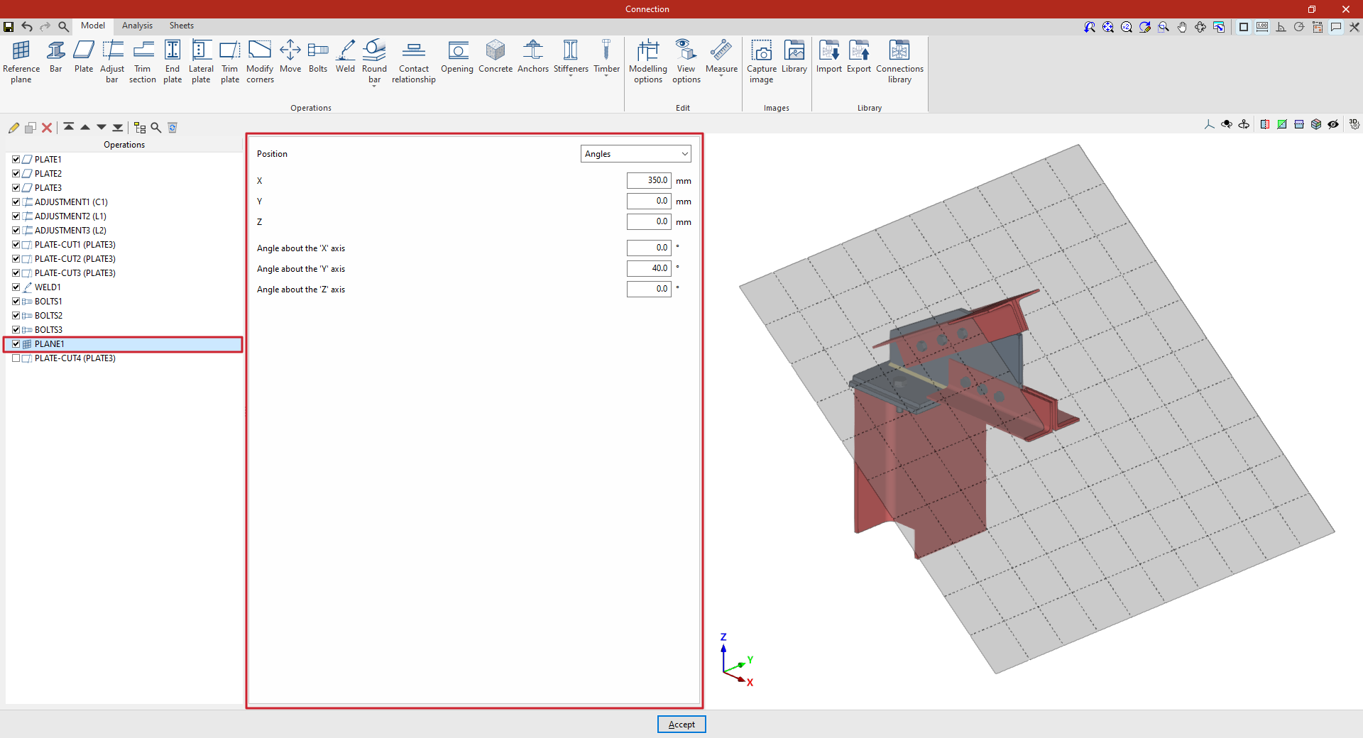 Después, se rota el plano introduciendo el “Ángulo alrededor del eje ‘X’” y el “Ángulo alrededor del eje ‘Y’”. Estos valores se refieren a los ejes globales del sistema de referencia de la unión.