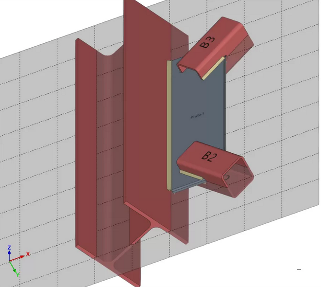 | En el ejemplo aquí mostrado, se han introducido placas, tornillos y soldaduras, y se han realizado operaciones de ajuste sobre los perfiles de la unión. Para completar la unión, se introduce una barra auxiliar situada entre las placas soldadas al pilar C2 y a la viga B1. Esta barra no ha sido introducida previamente en la definición de perfiles del nudo. |