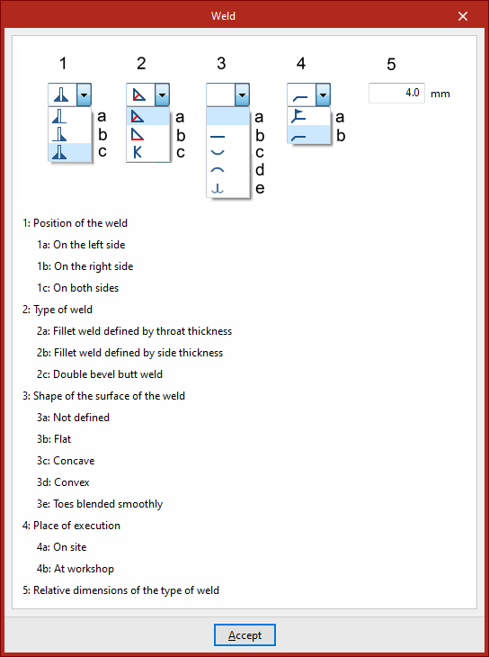 Dentro de cada apartado, en los desplegables se muestran varias posibilidades para definir la posición del cordón de soldadura, el tipo de soldadura, la forma de su superficie y el lugar de ejecución, ya sea en obra o en taller.