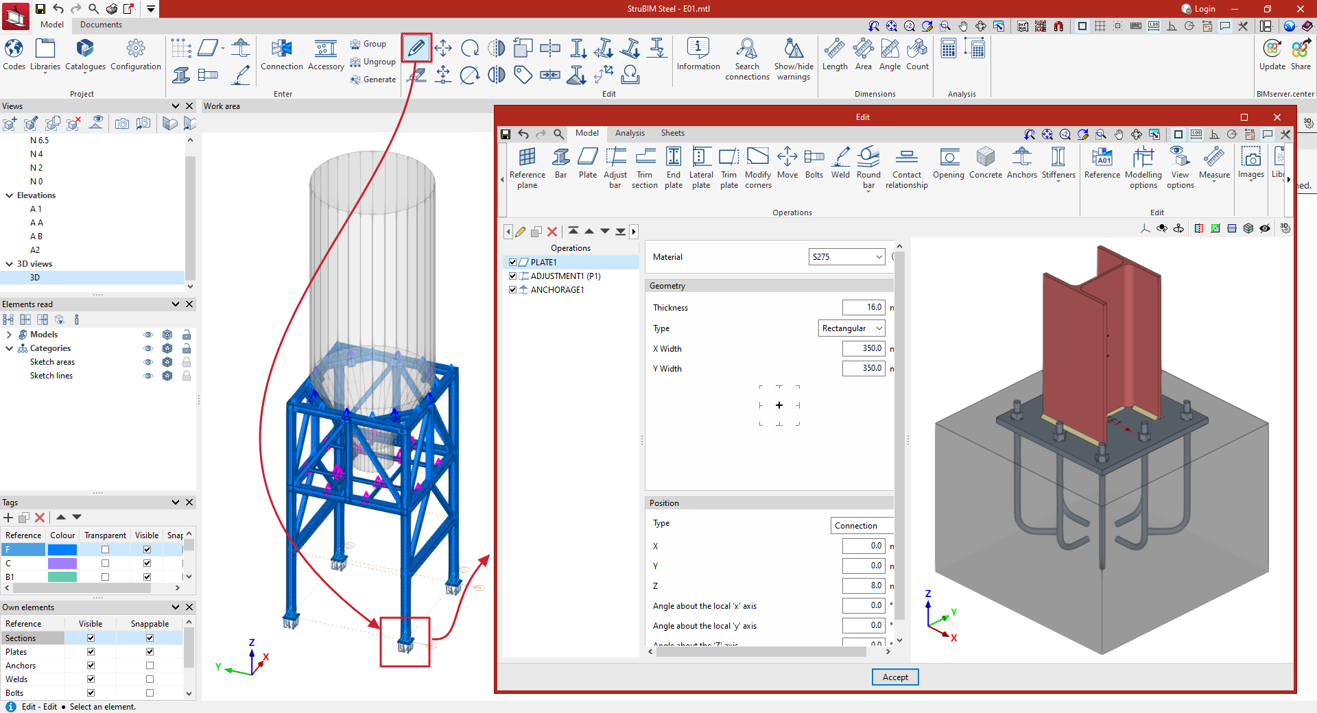 - en StruBIM Steel, se utiliza la opción "Editar" sobre la unión en la pestaña "Modelo" (introducida previamente desde la opción "Unión").