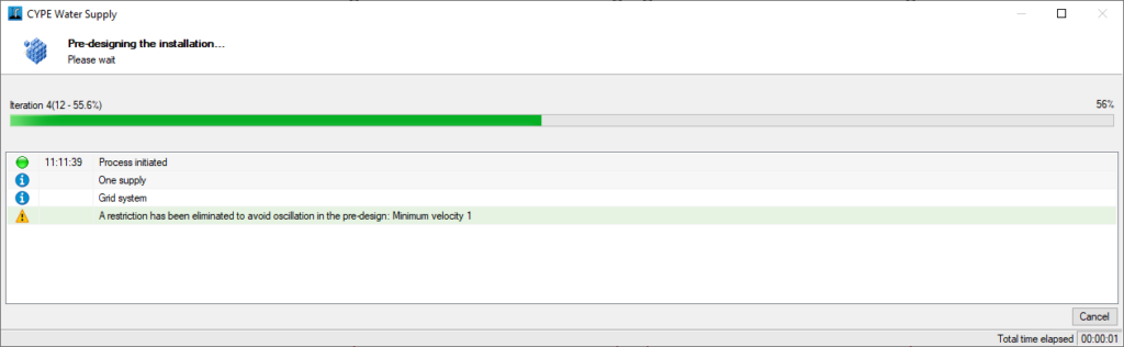 Lanza un proceso de predimensionado automático de la instalación. Al predimensionar, el programa tratará de optimizar y seleccionar el diámetro mínimo que cumpla todas las restricciones de velocidad y presión, manteniendo el material seleccionado.