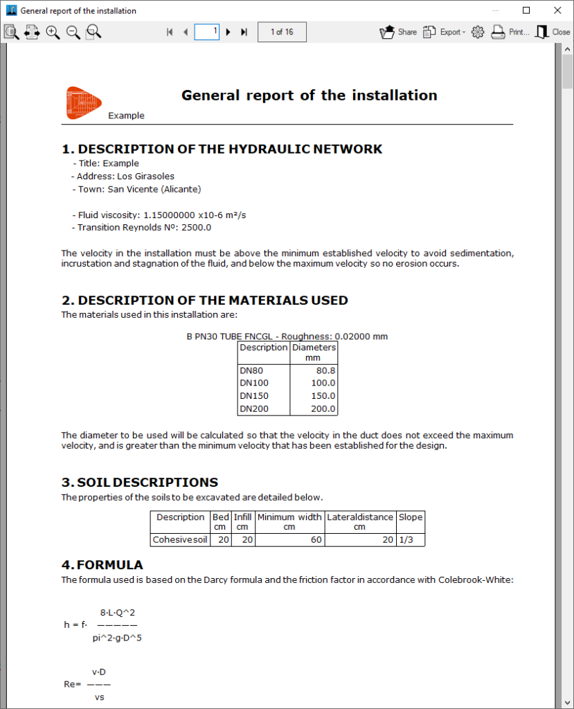 Permite imprimir el listado general de la instalación. Incluye los siguientes apartados, que se pueden activar o desactivar:- Descripción de la red hidráulica (opcional)
