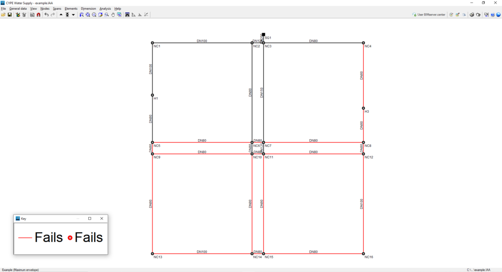 Para saber el motivo por el que un nudo o un tramo no cumple se debe activar una combinación y examinar la "Leyenda" de colores que aparece en una ventana independiente. El código de colores indica las razones por las que no cumplen los nudos o tramos de la instalación.