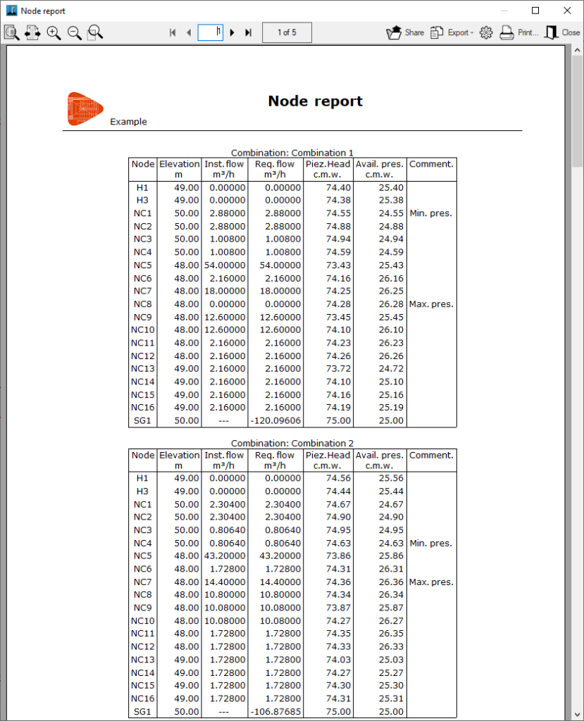 - Tercera combinación y siguientes: 50 % consumo de viviendas, 100 % consumo de dos hidrantes seleccionados