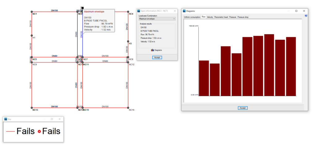 Tras realizar el cálculo, el programa muestra los resultados en pantalla al seleccionar un elemento de la instalación pulsando en "Nudos" y en "Información", o en "Tramos" y en "Información".